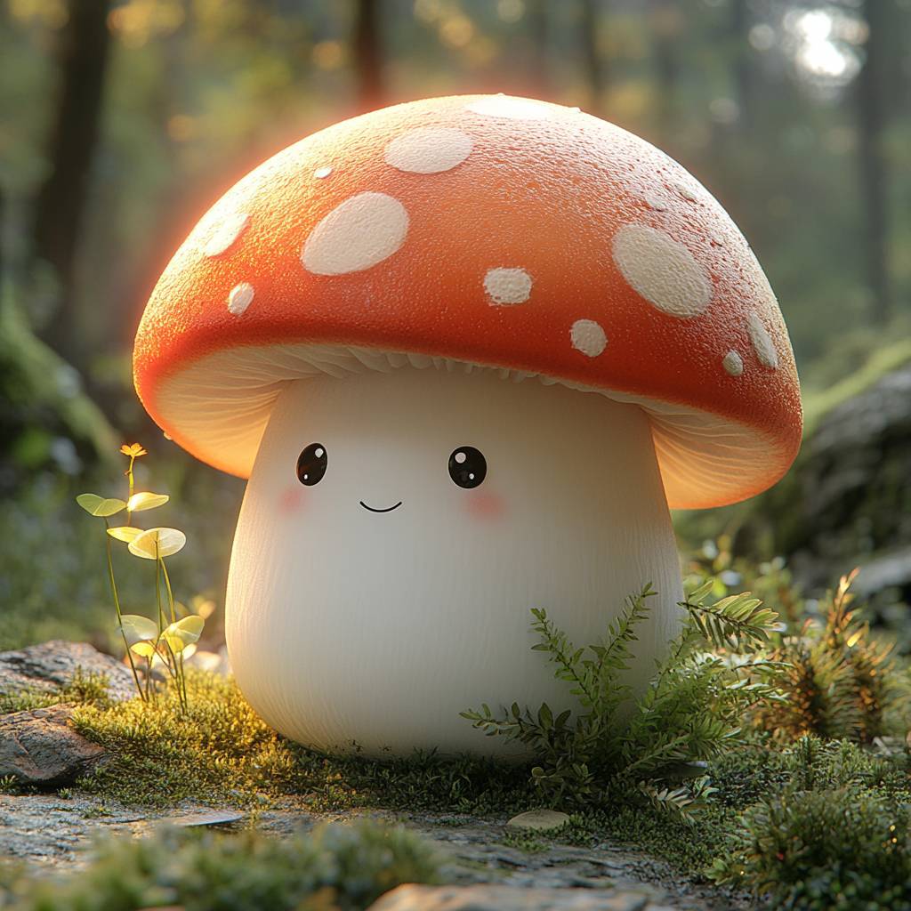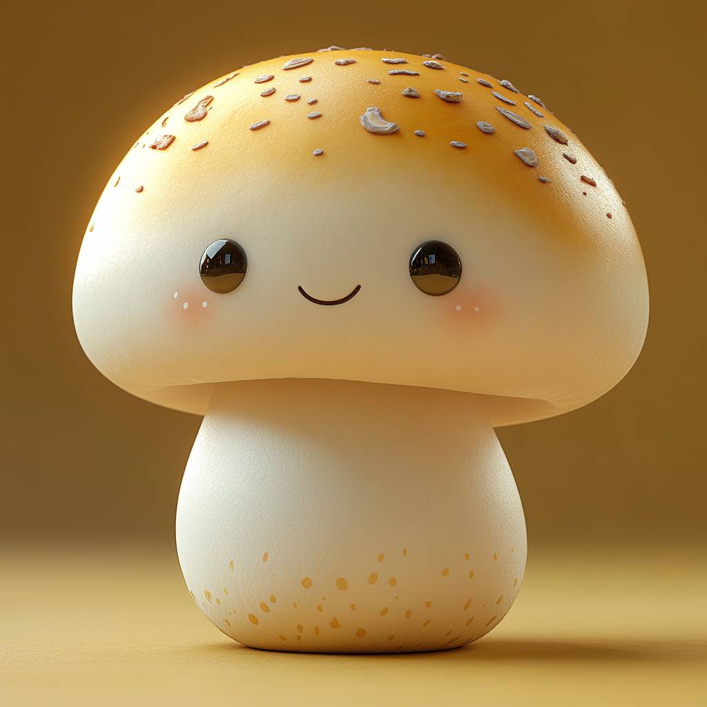 生成一只蘑菇的正面图,全身镜头,极简主义,动漫卡通风格,可爱,干净的白色背景,泡泡市场风格,皮克斯,软色调,工作室灯光,3D,C4D,Blender,超高清,8K