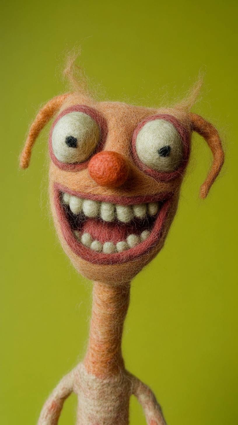 一个可怕的人形毛毡木偶,细节丰富,微笑着。