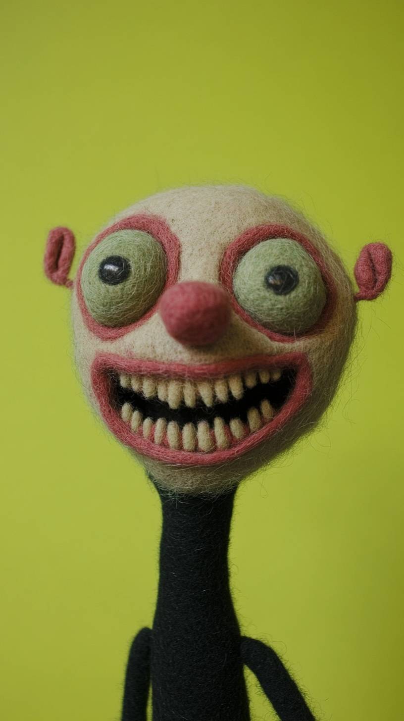 a creepy human felted puppet with fine details including a long neck, a nose, two ears, a mouth, big lips, and eyes with visible eyelids, the character is smiling with its teeth with a closed jaw, the mouth is a smaller size, the puppet is in front of a 100% solid neon green background facing directly forward --ar 9:16 --v 6.1