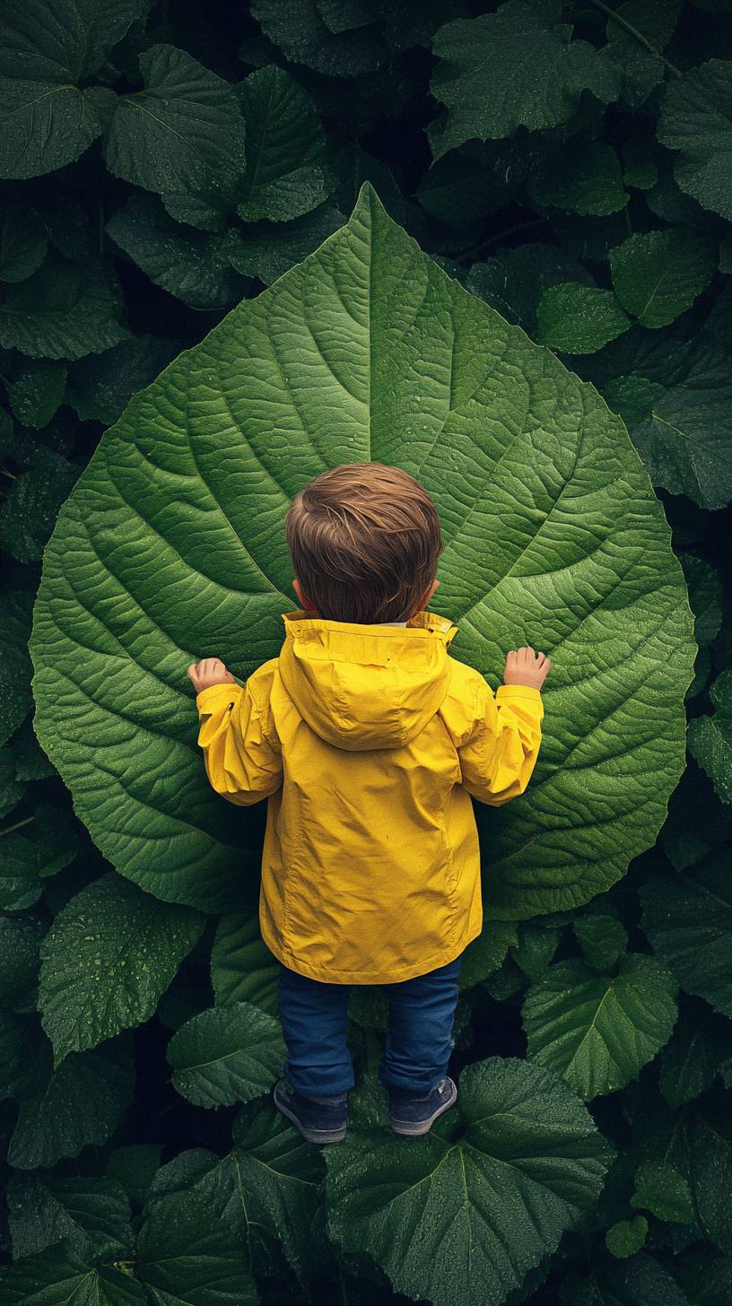 一个穿着黄色雨衣的小男孩站在巨大的绿叶上。