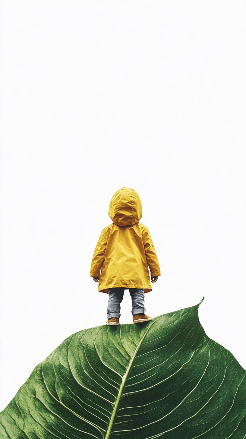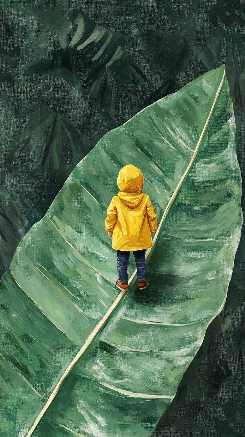 一个穿着黄色雨衣的小男孩站在一片巨大的绿叶上。