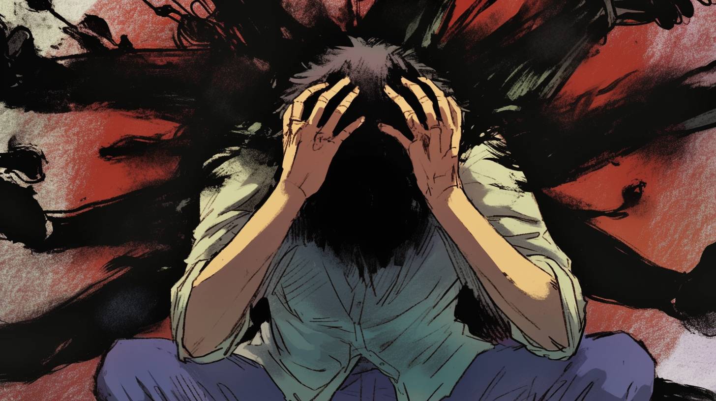 一个心理失常者的手绘图,厚重的色彩笔触,神经错乱,精神不稳定,令人毛骨悚然