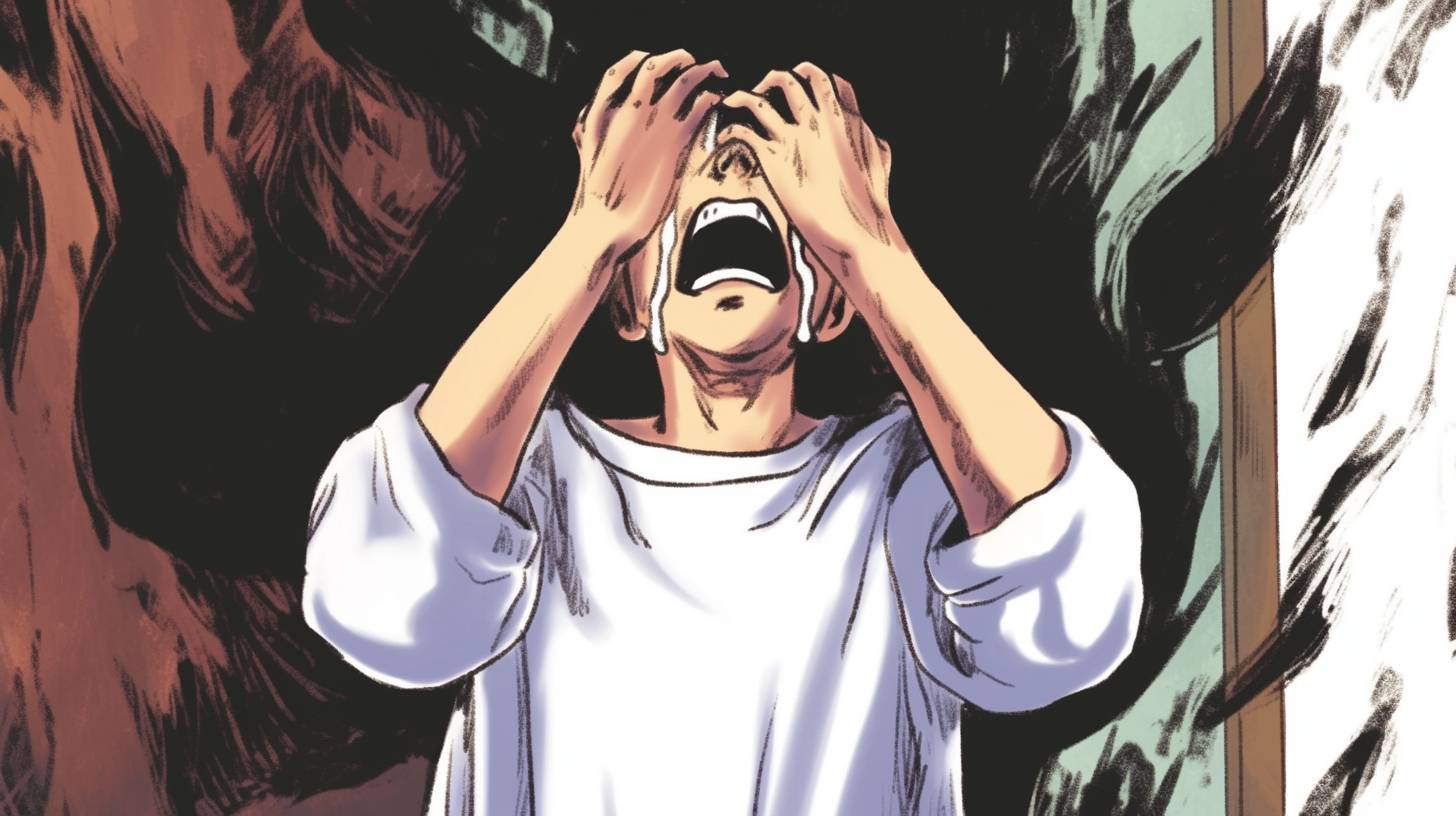 hand drawings of a disturbed person, thicks strokes of colours, deranged, mentally insane, spooky --ar 16:9 --style raw --sref 224194394 --niji 6