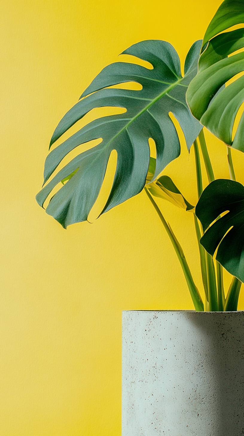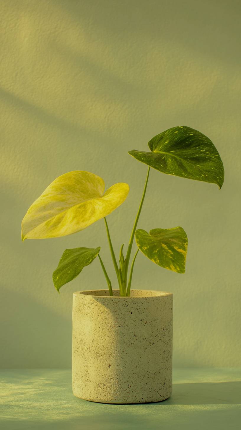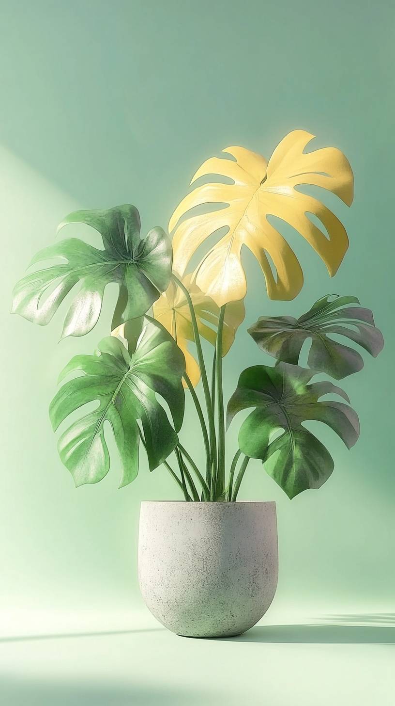a concrete pot with a light yellow and green monstera thai constellation, studio photography, sage background --ar 9:16 --v 6.1