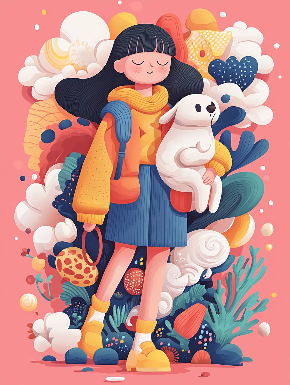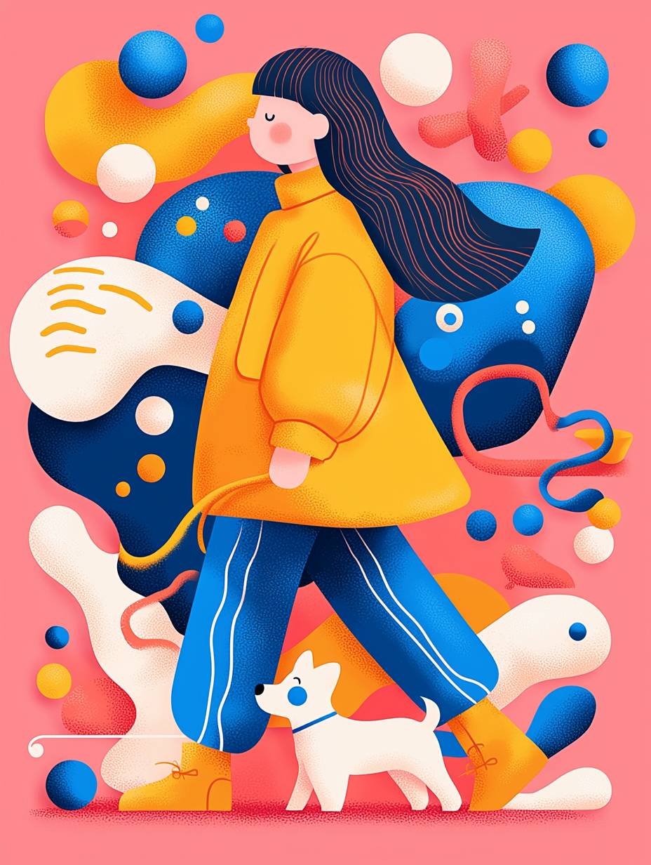 一个女孩带着狗,背景色彩鲜艳,带有街头艺术风格。