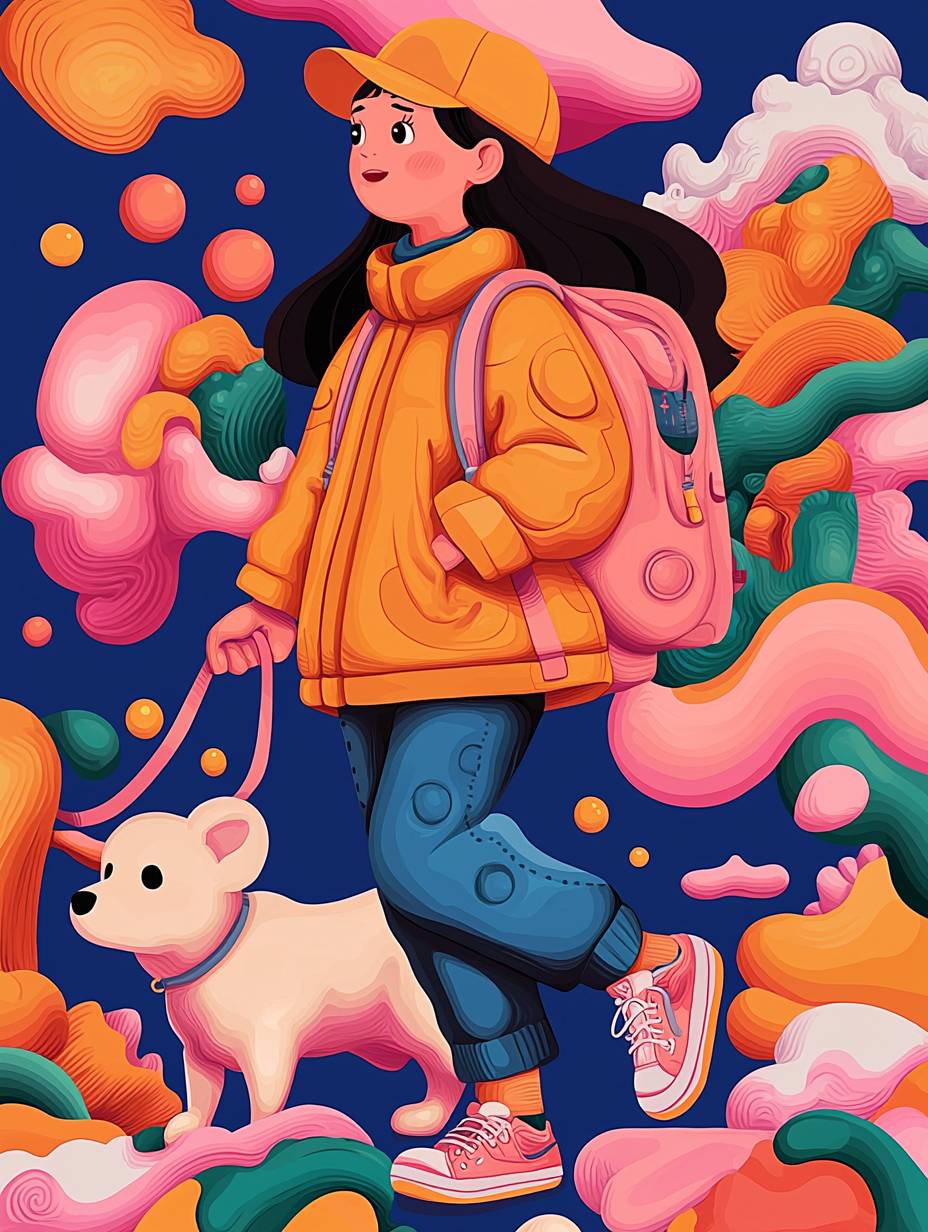 cartoon characters a girl walking a dog,, surrounded by quirky floating elements, bold pink and blue gradient background, graffiti-style details, kawaii facial features, retro gaming icons, urban fantasy, neon glow filter, animated swirling patterns, pulsating color aura, floating bubble effects, pixel art elements, comic book halftones, street art style photo, --ar 3:4 --quality 2 --style raw --personalize rd9y55c --stylize 750 --v 6.1