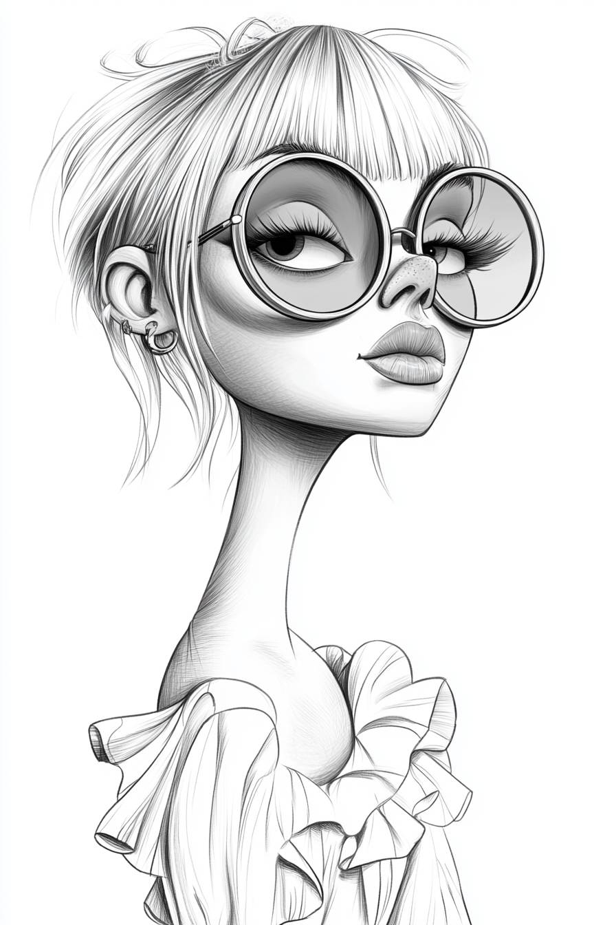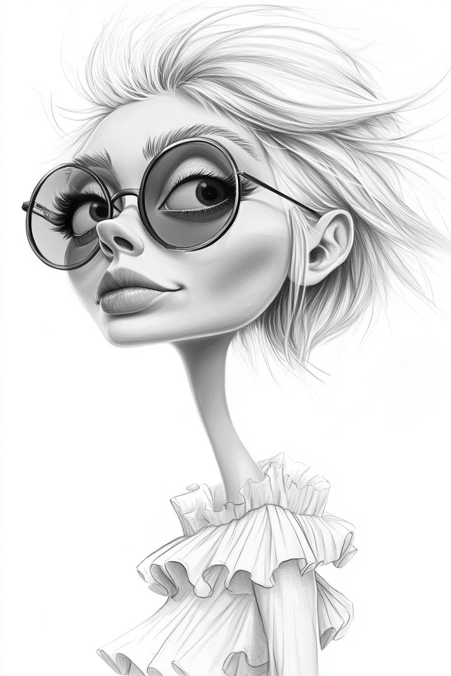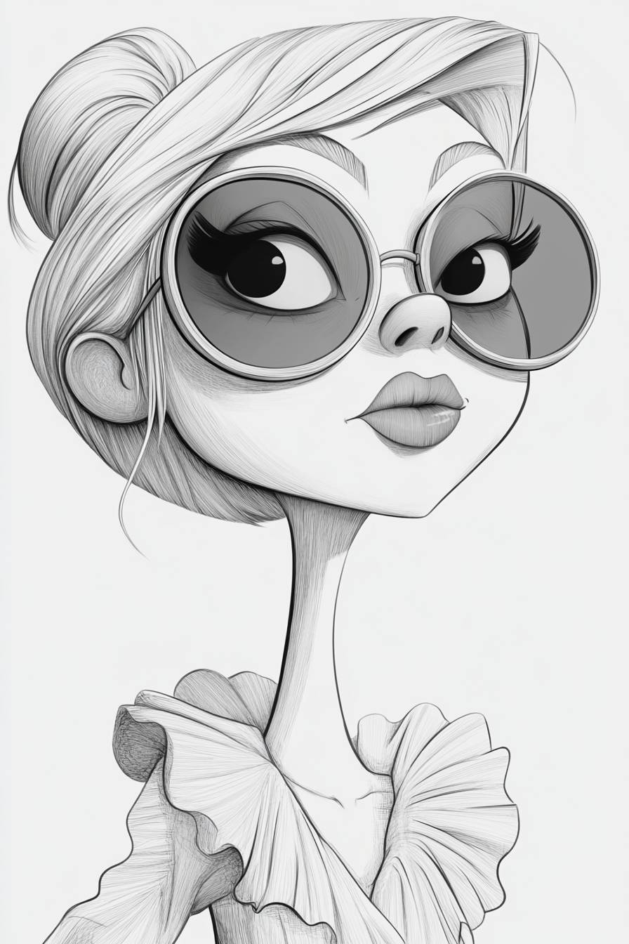 light grayscale, coloring book page, funny caricature, stylish cartoon lady, female, unspecified ethnicity, 25 years old, blonde-haired, , pointy-nosed, exaggerated facial features, elongated neck, oversized head, slim body type, large eyes, pointed nose, pursed lips, aloof expression, the cartoon lady is wearing a white ruffled top, accessorized with large round sunglasses, , white fur coat, side profile pose, bright white background --ar 2:3 --style raw --v 6.1