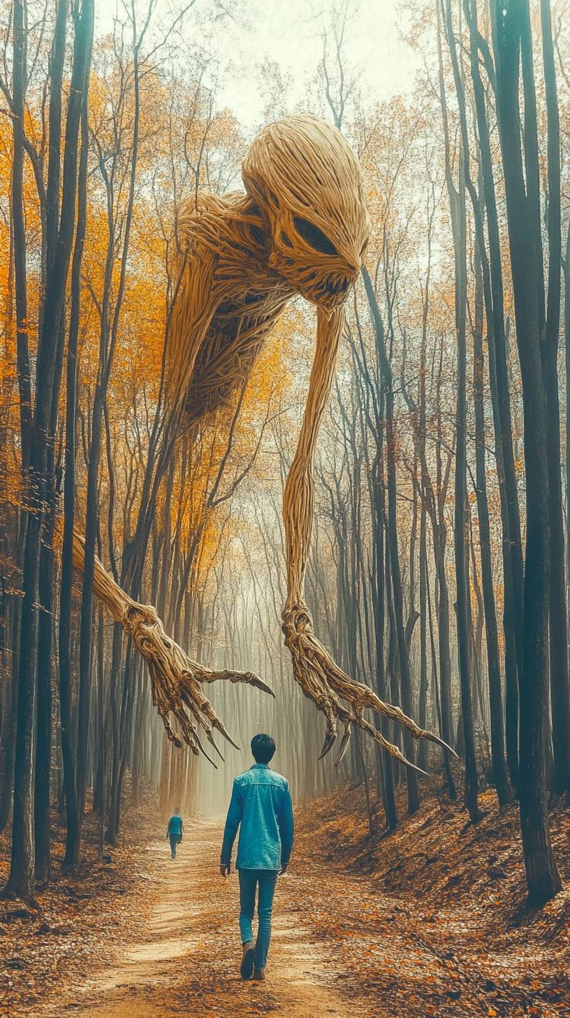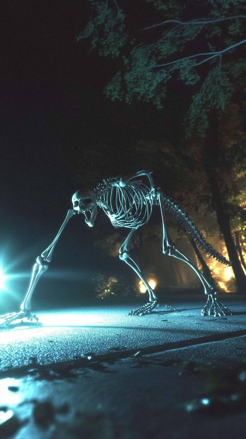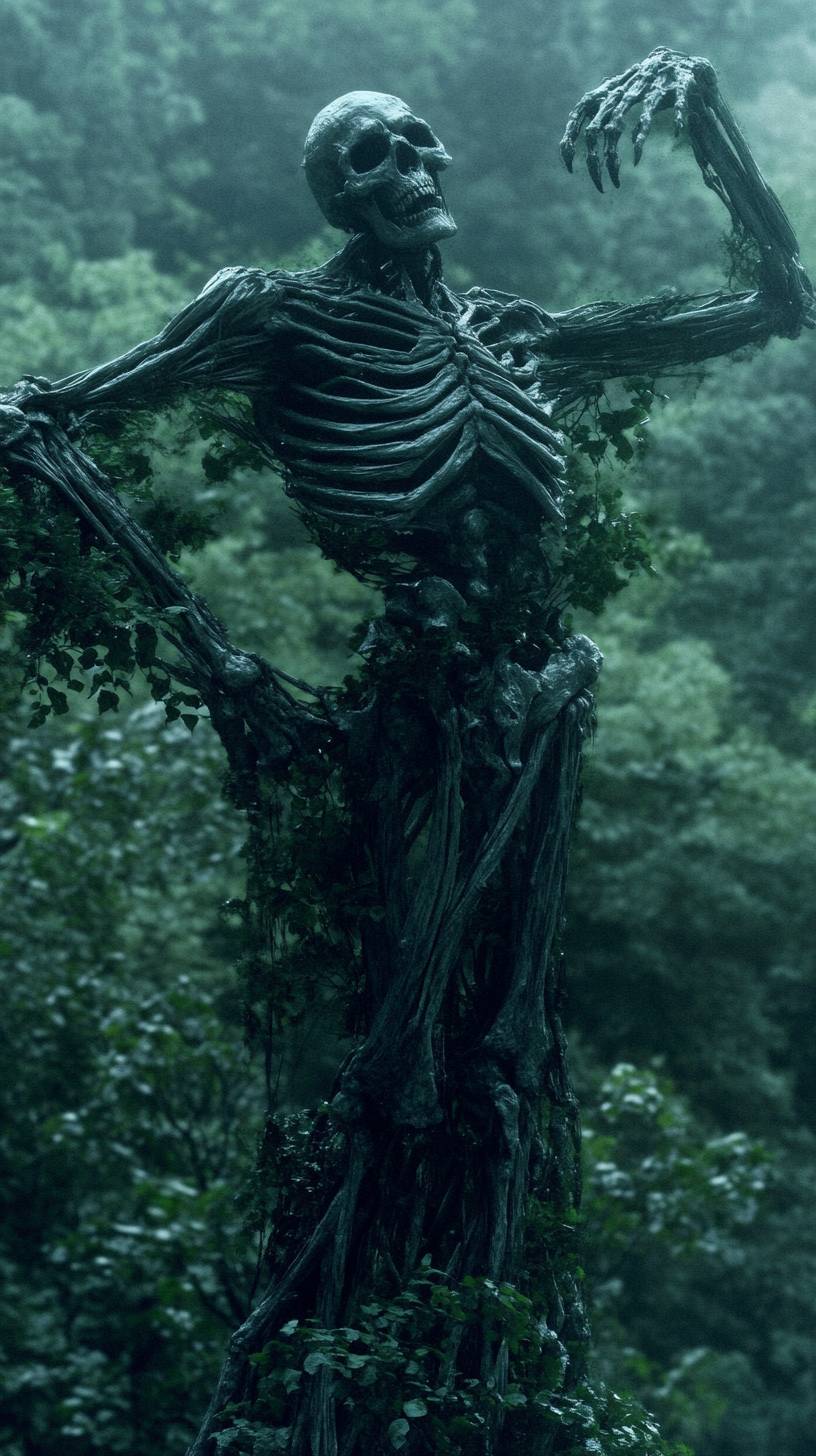 Ultra photorealistic cinematic image, 9:16 aspect ratio, zoomed out shot, full body shot, Gashadokuro: Giant, skeleton-like creatures from Japanese folklore that stalk the night, searching for human prey in forests --chaos 75 --ar 9:16 --style raw --stylize 1000 --weird 300 --v 6.1