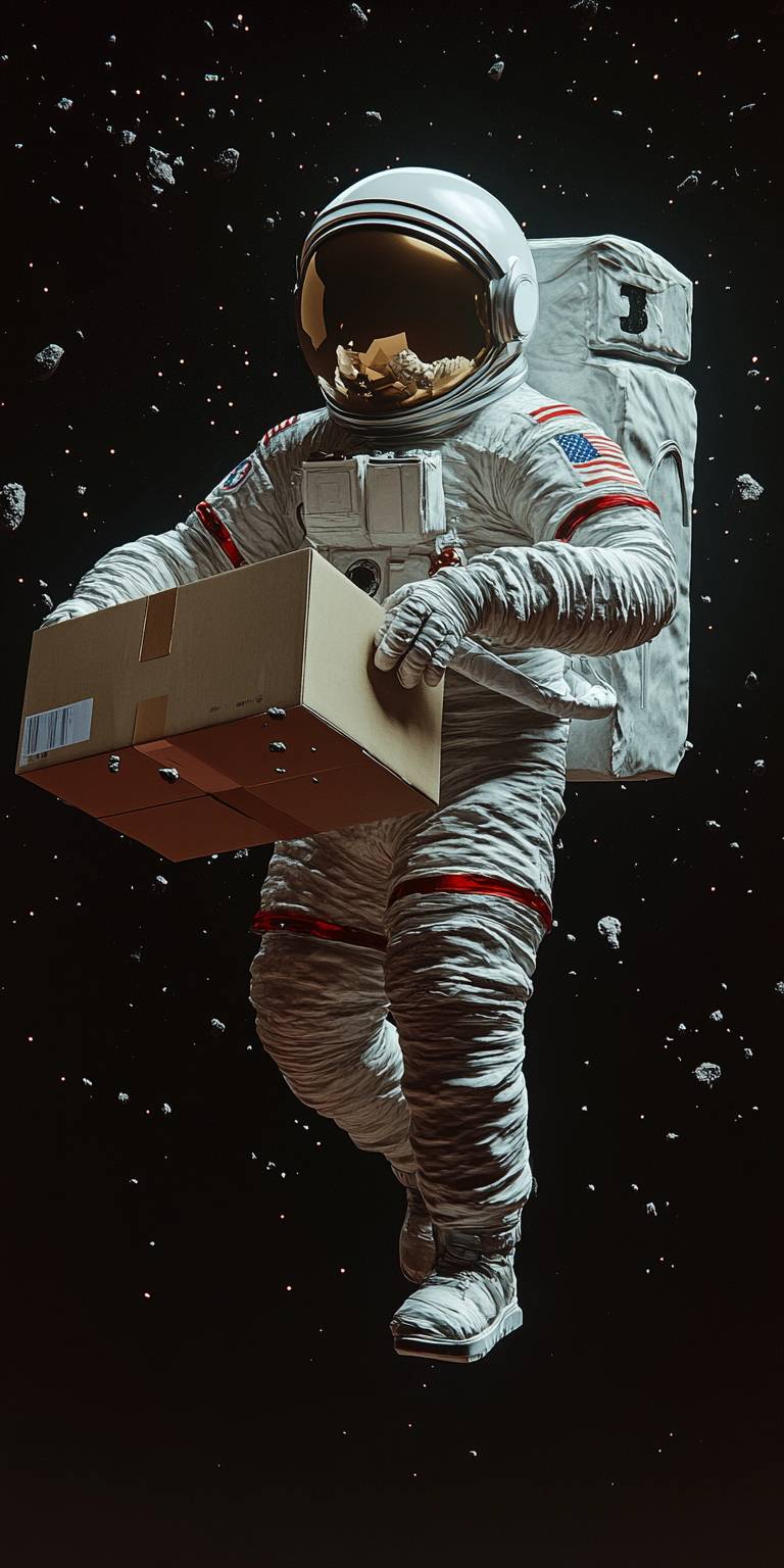 astronaut uber delivery, outer space, realistic, photorealistic --ar 1:2 --v 6.1