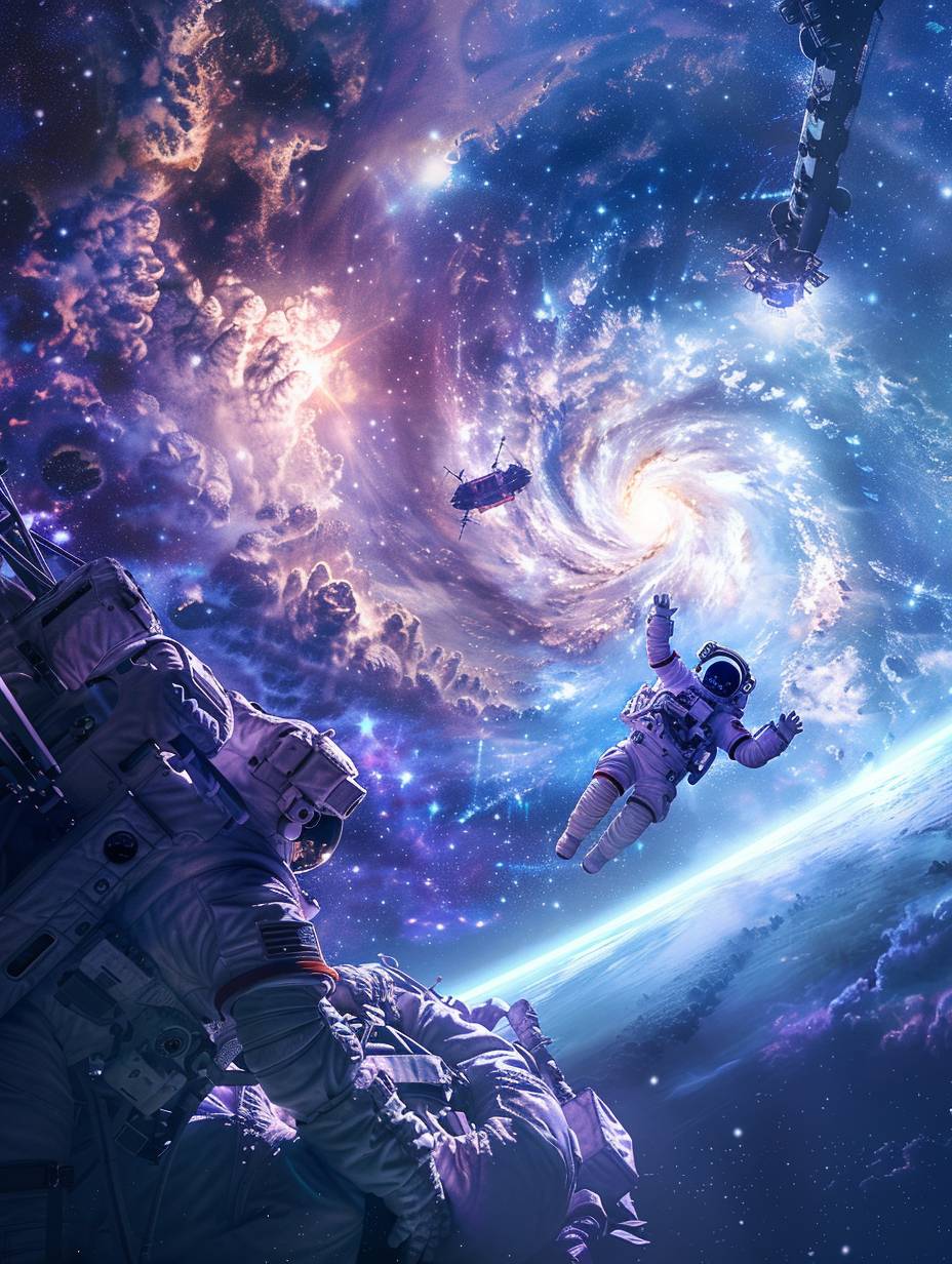 一个围绕遥远行星 orbiting 的太空站,宇航员身穿流线型的太空服正在进行太空行走,背景是旋转的星云。