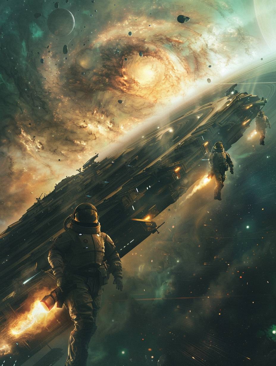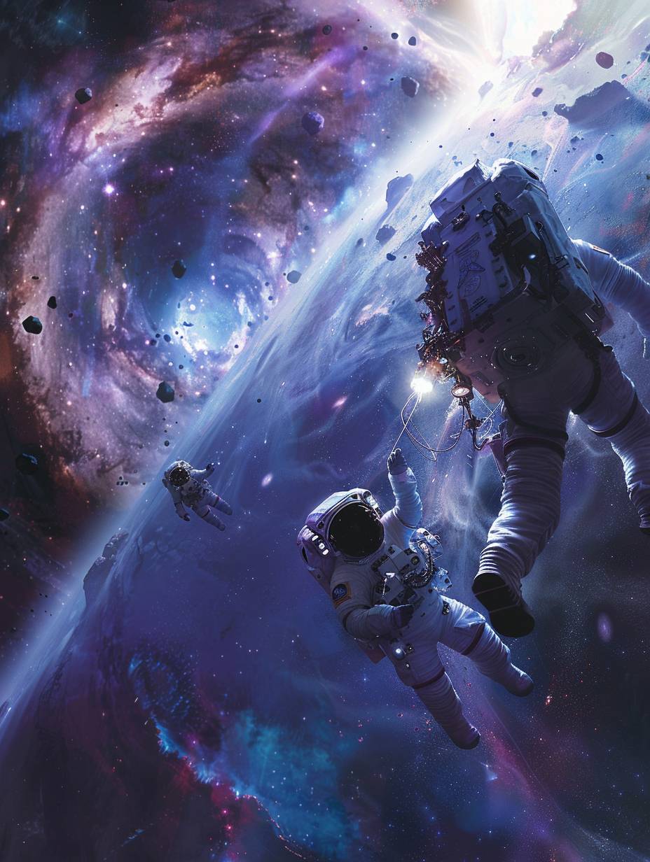 A space station orbiting a distant planet, with astronauts in sleek spacesuits conducting a spacewalk as a swirling nebula fills the background.-sref 791643582 --ar 3:4 --v 6.0