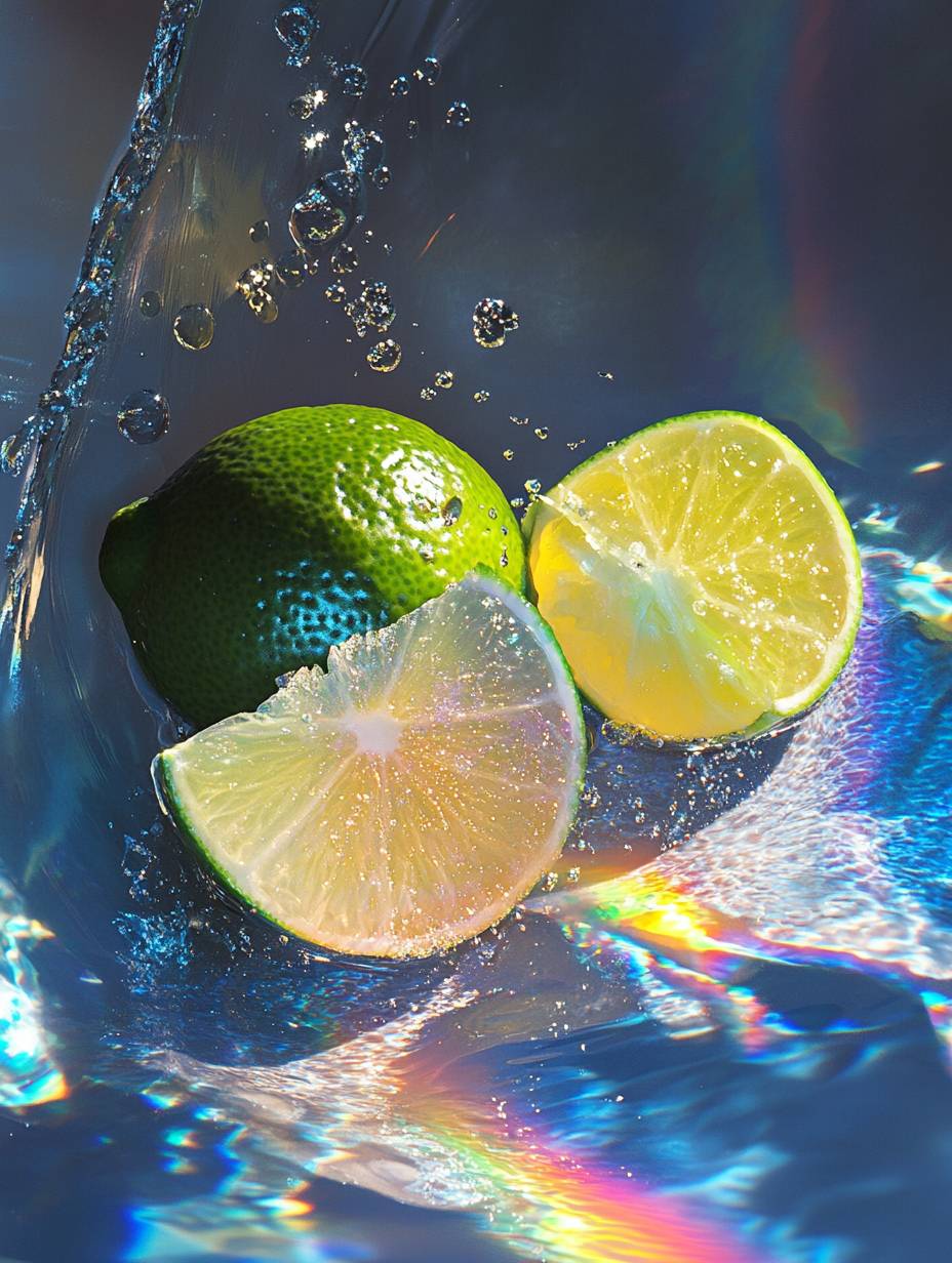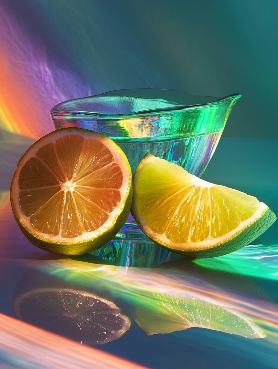 物体呈现彩虹效果,风格为照片真实主义的静物,展示透明的青柠。