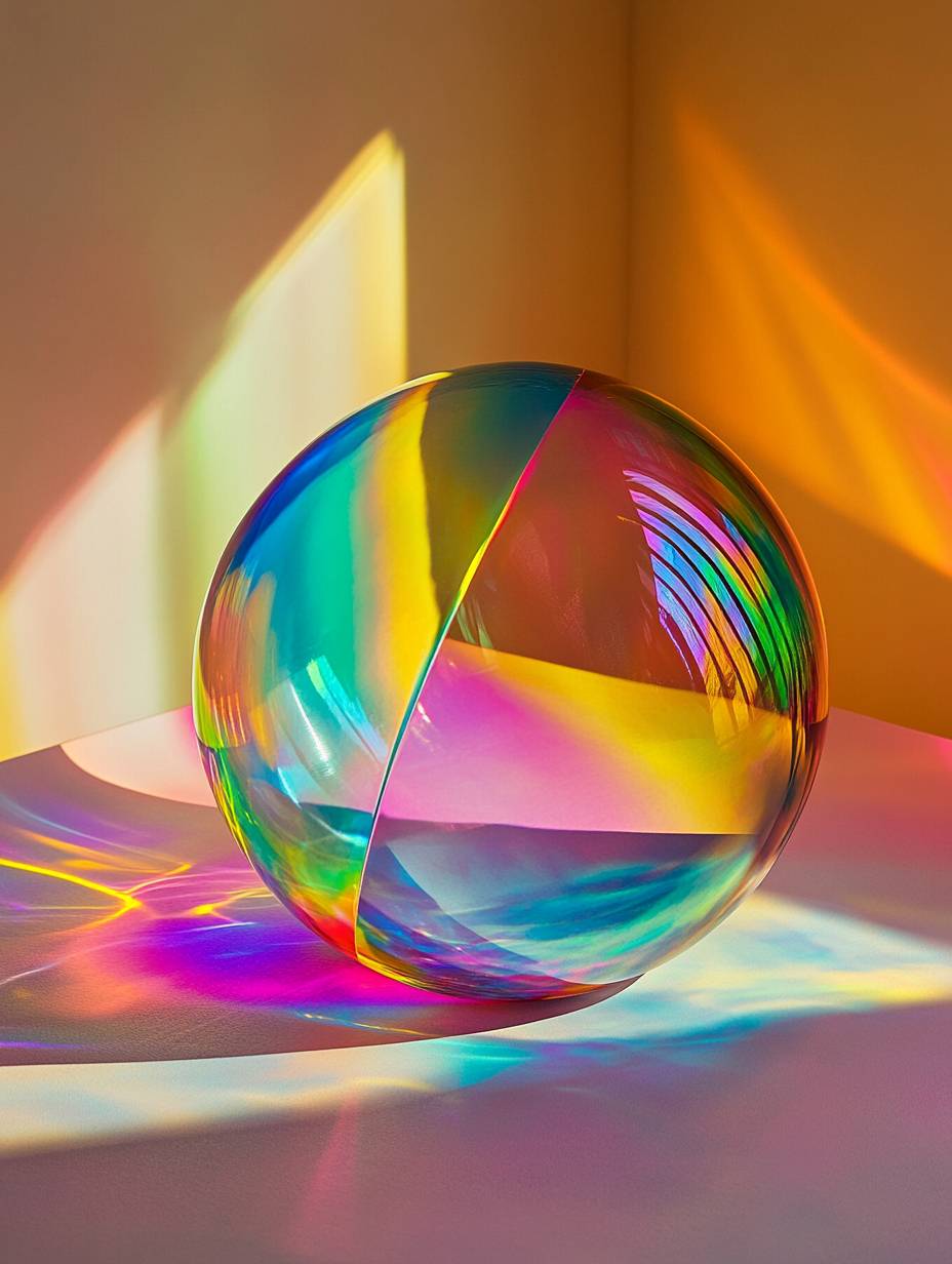 一个物体呈现出彩虹效果,采用超写实的静物风格,太阳化,厨房静物,青柠,微距摄影,透明感