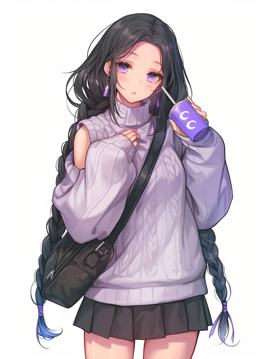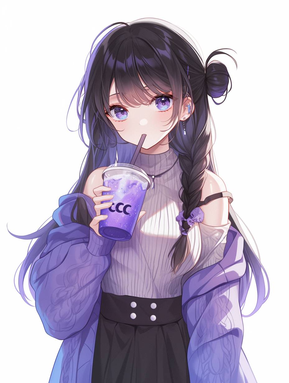 A Chinese girl with braided hair on one side reaching above her shoulder, black hair, wearing a white base layer, a light purple hollow thin sweater, a black A-line long skirt, holding a purple oval-shaped tumbler with a straw, with the letters "CC" embroidered on the sleeve. --ar 3:4 --niji 6