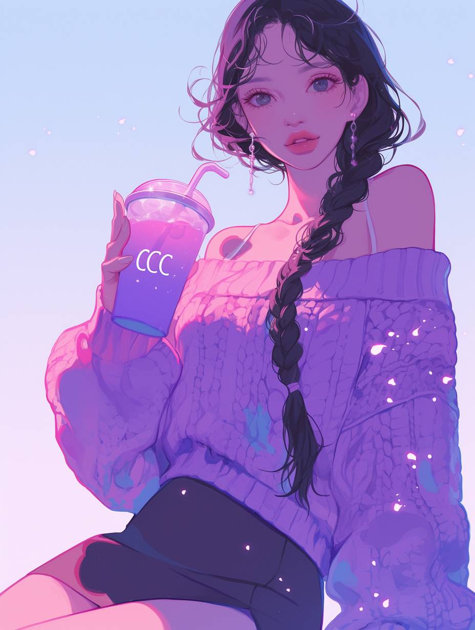一位中国女孩,一侧扎着辫子,黑色长发披肩,穿着白色底层衣服,浅紫色空心薄毛衣,黑色A字长裙,手里拿着一个紫色椭圆形的水杯,上面带有吸管,袖子上刺有"CC"字母。