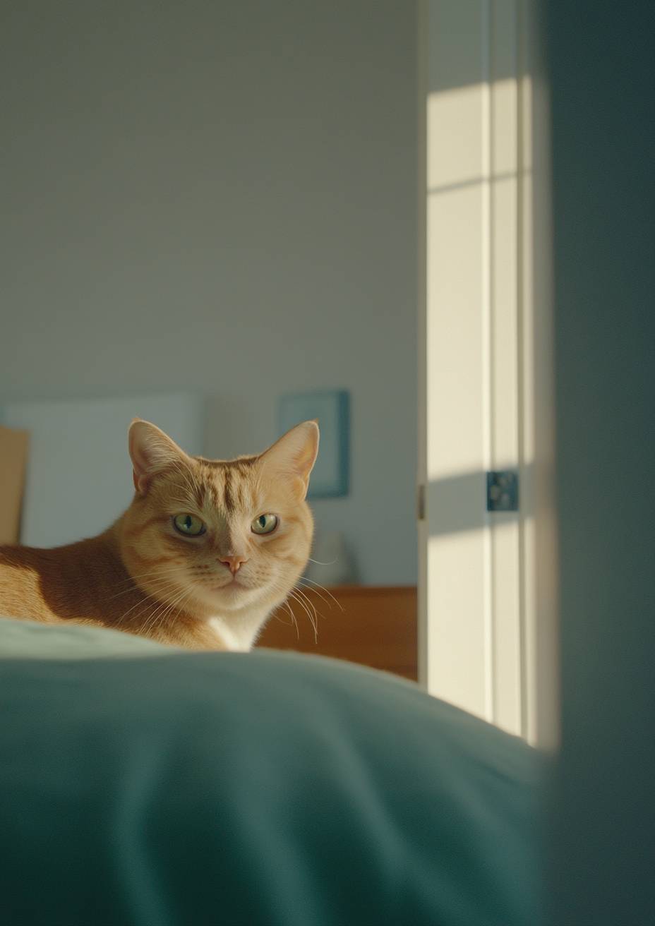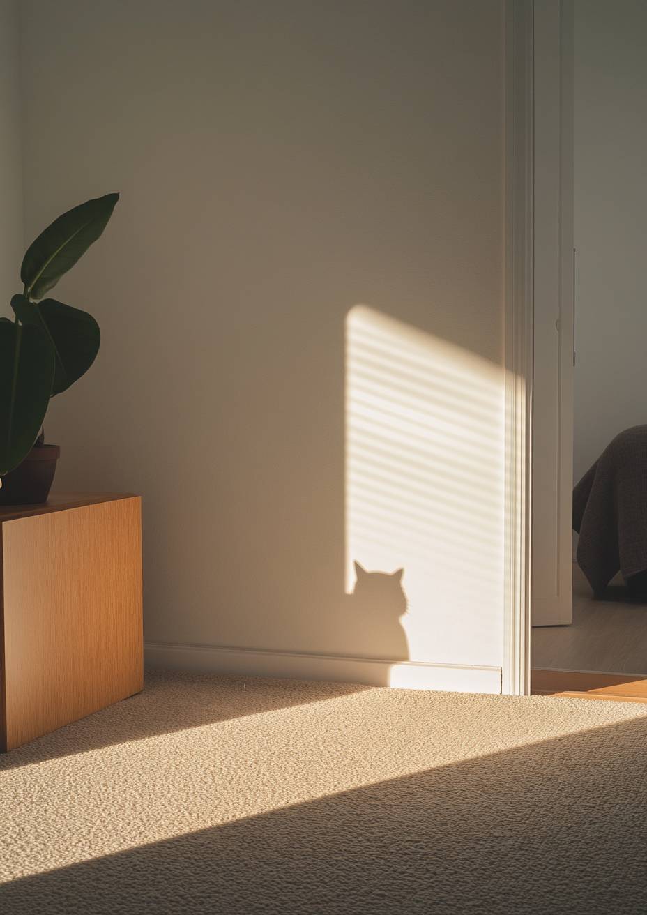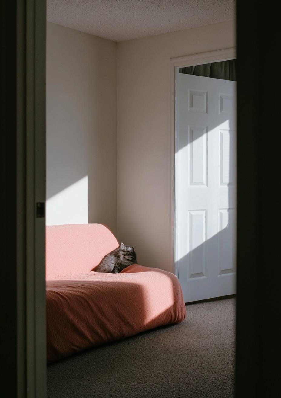 一只猫在昏暗的房间里,狗脸的一半被光照亮,而另一半则进入阴影。分割的光线创造出戏剧性的效果,阴影投射在房间的墙壁和家具上。拍摄于佳能EOS R5。