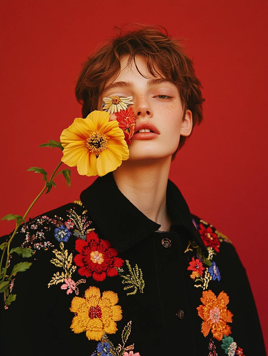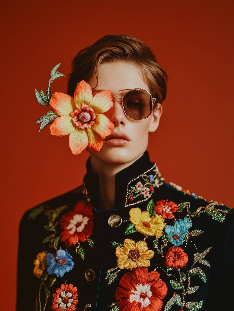 一幅中性人的肖像,身穿一件黑色刺绣外套,上面绣有五彩斑斓的花朵,一只眼睛被面前的花朵遮住,风格类似于布鲁克·迪多纳托,背景为纯色,超现实主义摄影,对称构图,柔和的光线,仰拍,高分辨率。