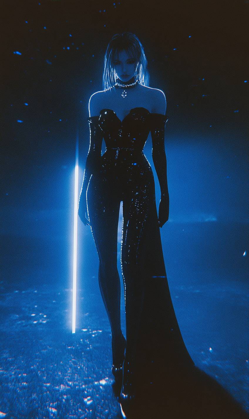 动漫女性角色,优雅的晚礼服,露肩设计,闪亮细节,高跟鞋,精致珠宝。