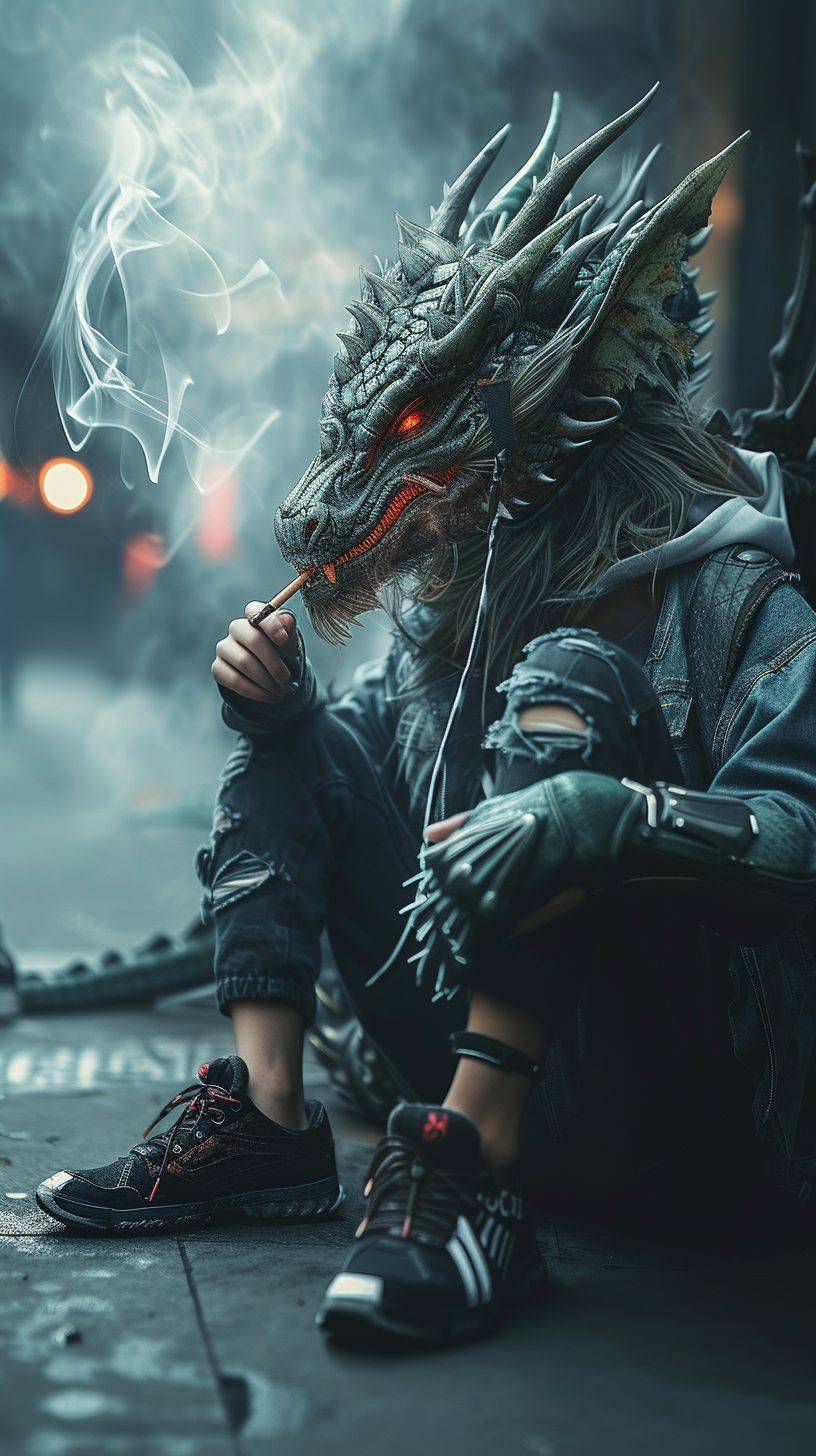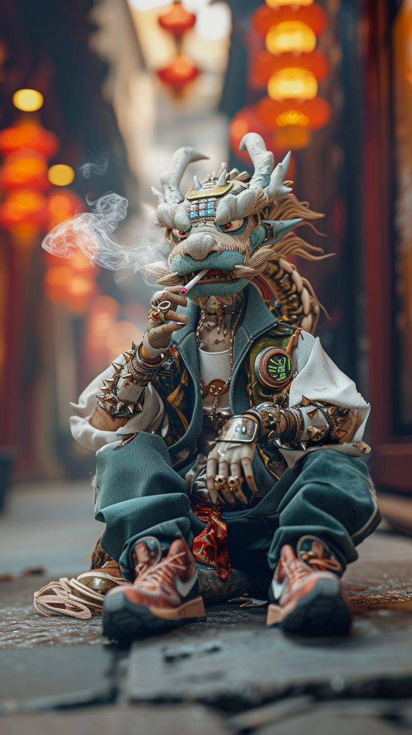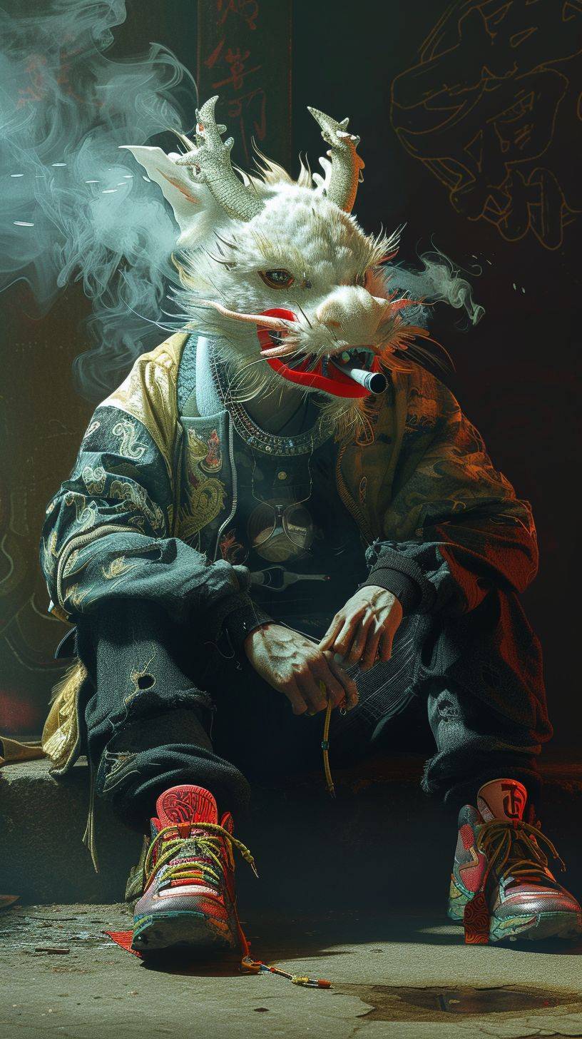 The leading figure of the Chinese dragon, cyberpunk style, is smoking with a dragon mouth, sitting on the ground wearing trendy shoes, with rich details and clear clothing. --style raw --ar 9:16 --v 6