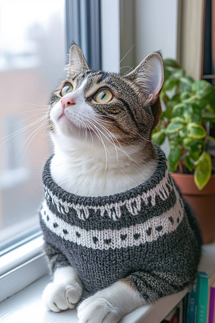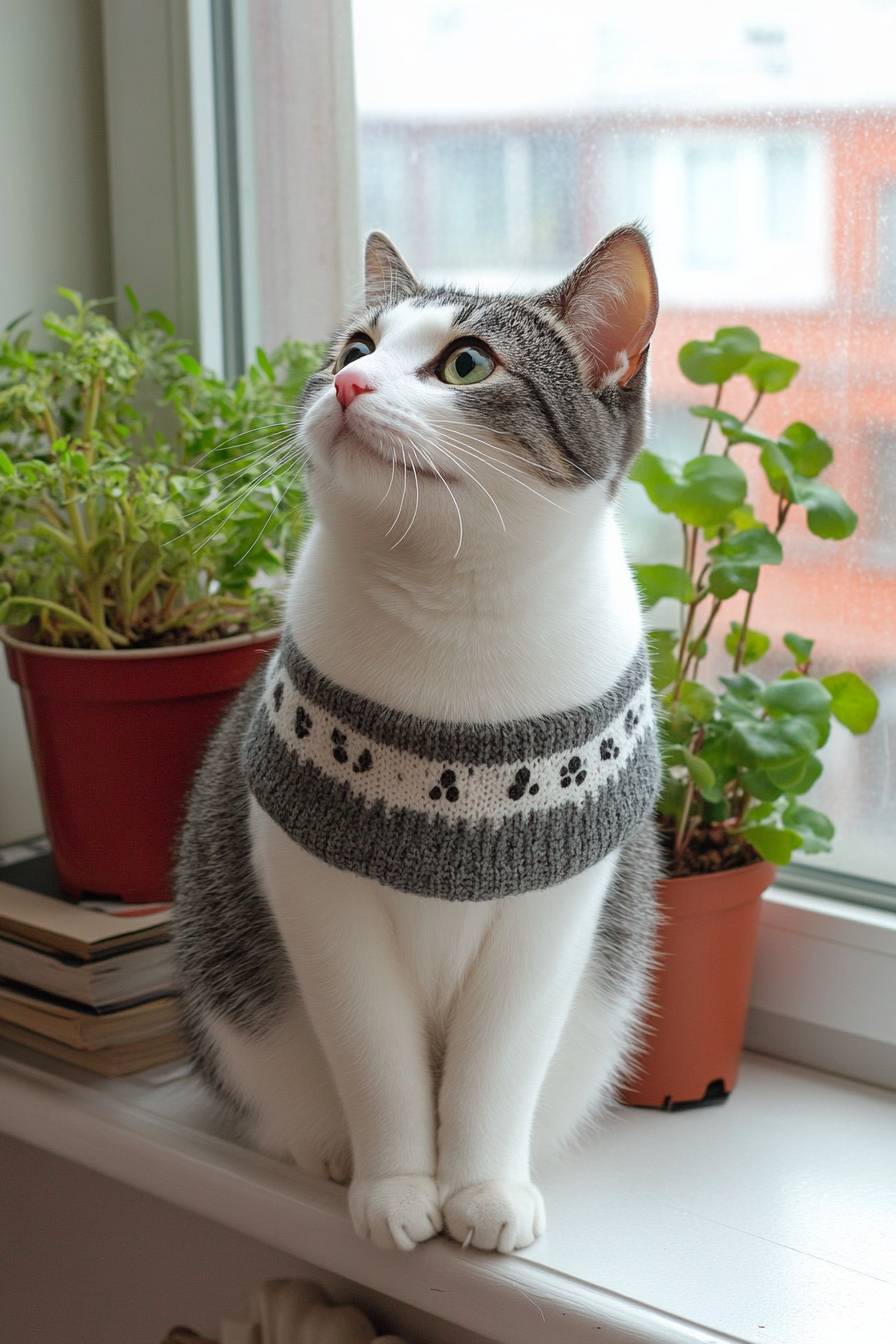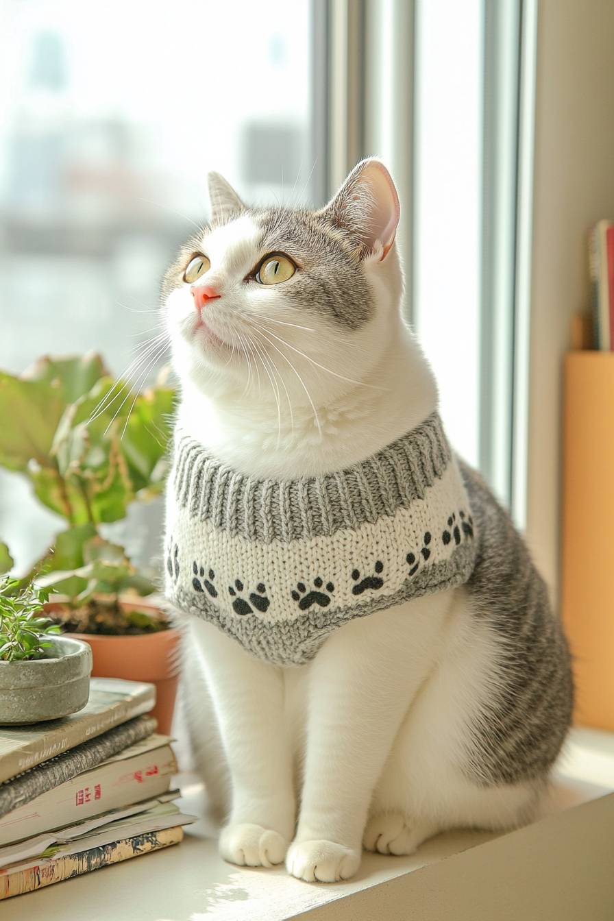 Gray and white cat sitting gracefully on a windowsill, wearing a small, cozy sweater with paw patterns. Sunlight streaming through the window, casting a warm, golden glow. Behind the cat, a few potted plants and a stack of books, creating a peaceful, homey atmosphere. --ar 2:3 --style raw --personalize ndbewqk --v 6.1