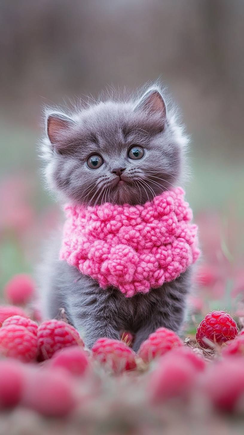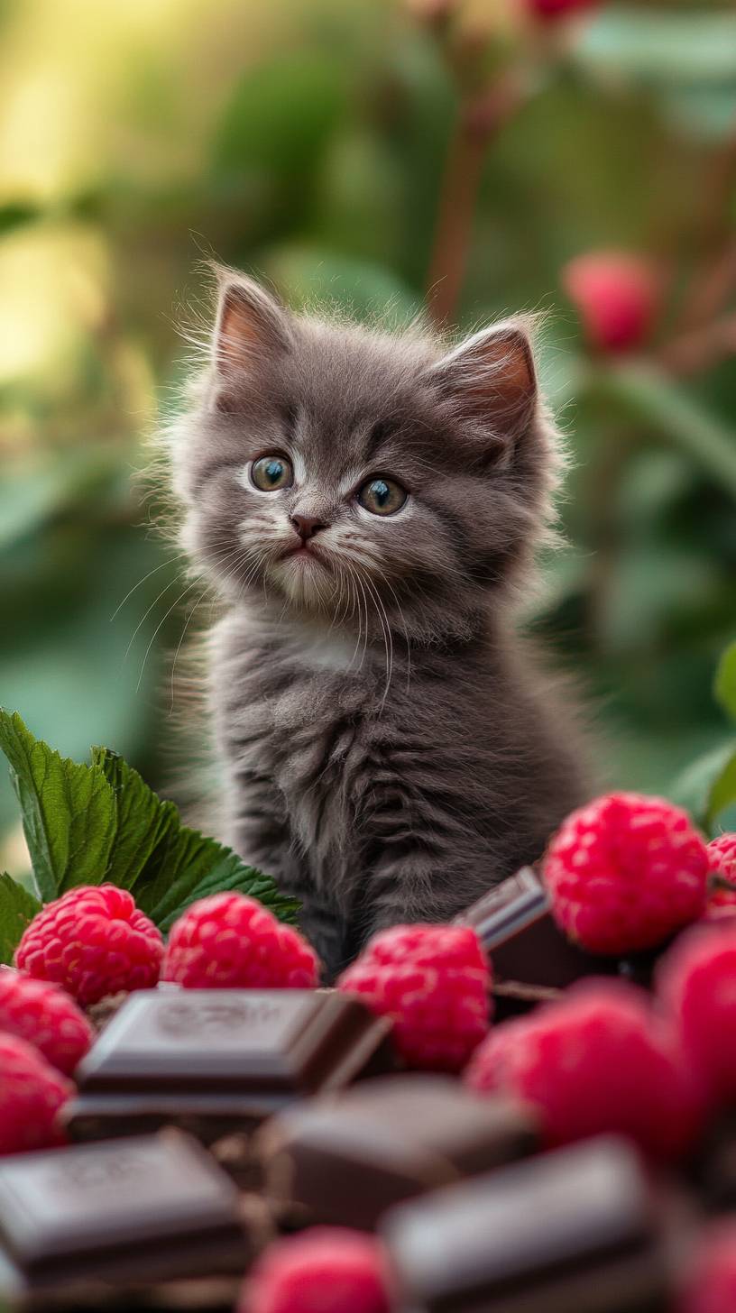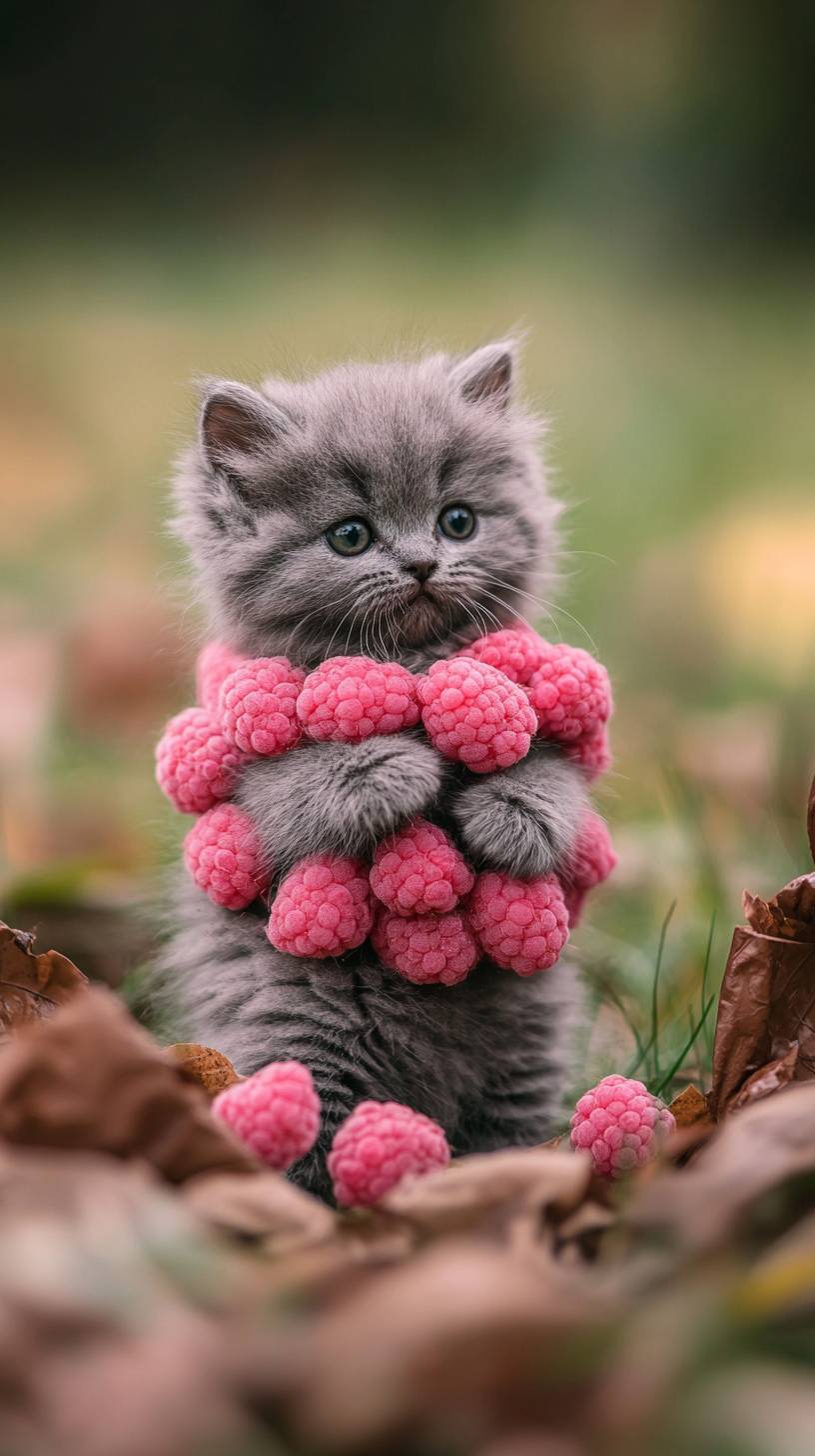 realistic photo of a cute grey fluffy kitten dressed totaly in pink raspberries stands on the meadow filled with brown chocolate pieces is on the background --ar 9:16 --style raw --v 6.1