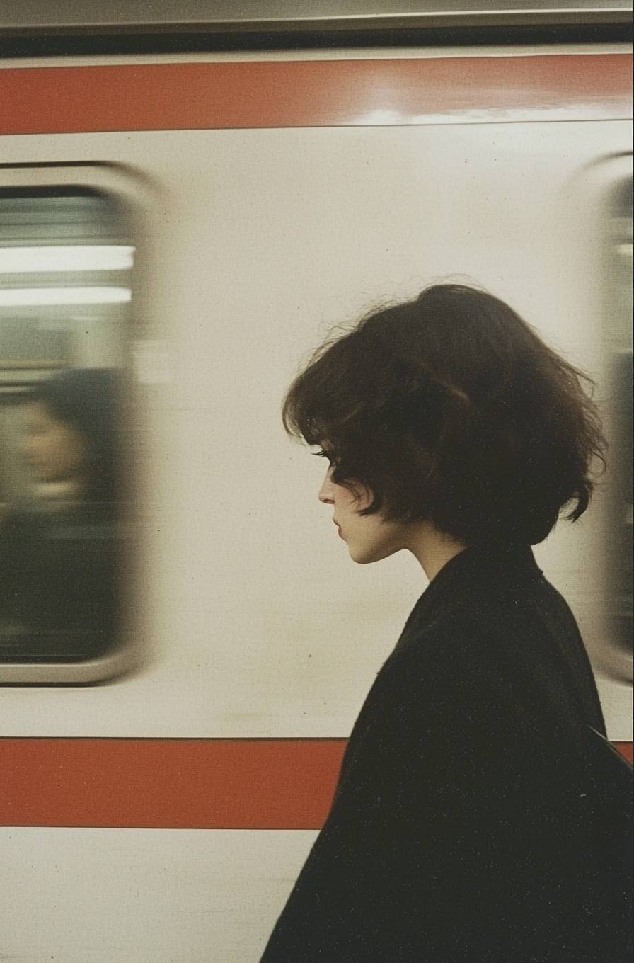 一张现代简约风格的时尚照片肖像。模特在地下车站的站台上运动,动感模糊。场景中有红白相间的条纹、玻璃反射和柔和的光线。形象中是一位短发棕色女性穿着深色衣服,站在地铁列车旁边,表现出简约时尚摄影师的风格。