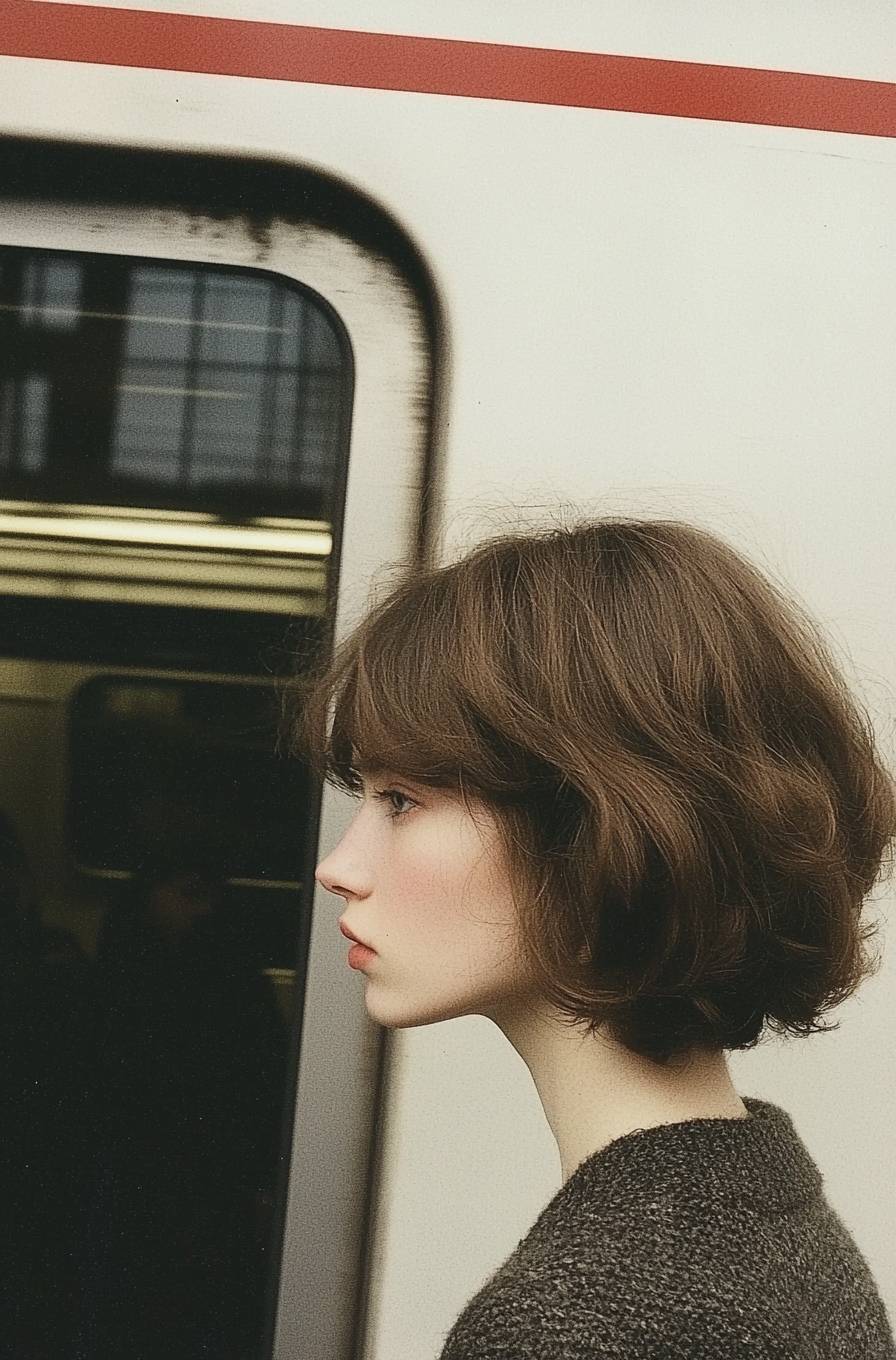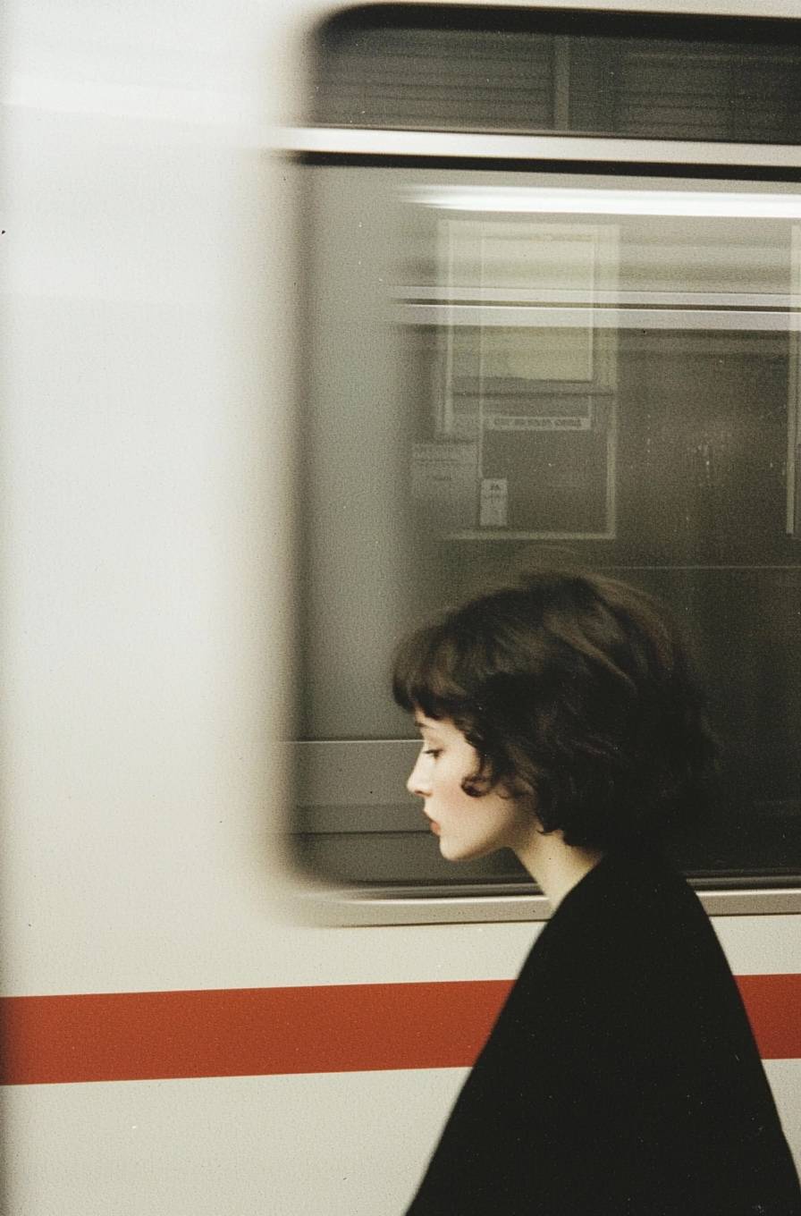 A modern, minimalist fashion photo portrait. The model is in motion on an underground station platform, with blurred movement. The scene features red and white stripes, glass reflections, and soft light. The image depicts a woman with short brown hair wearing dark , standing next to a subway train, in the style of a minimalist fashion photographer. --ar 76:115 --quality 2 --sref 3173356426 3478688306 --personalize ohbx4r7 --v 6.1