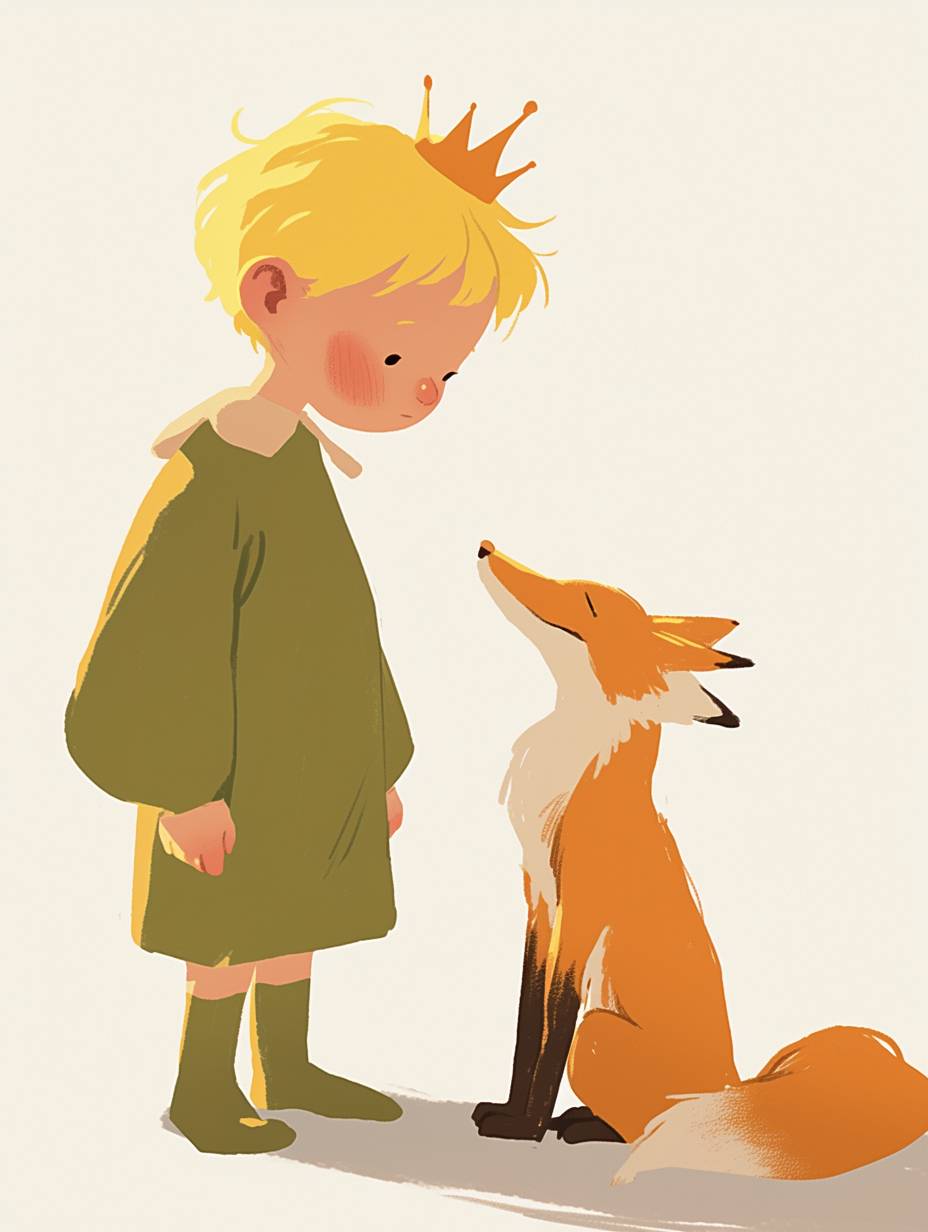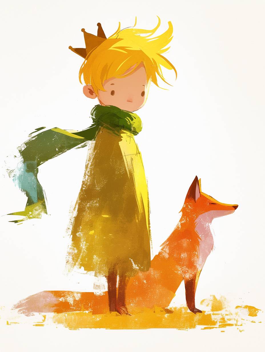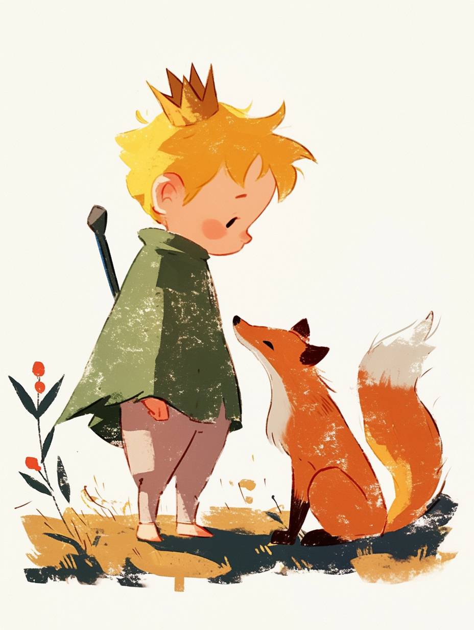 一幅简单的画作,描绘了金发的小王子和绿草。他头顶戴着皇冠,站在一只橙色狐狸旁边,背景是白色的。这是一幅简约风格的简单涂鸦,采用了平面的淡彩色调和钢笔素描,令人想起复古儿童书籍的插图。