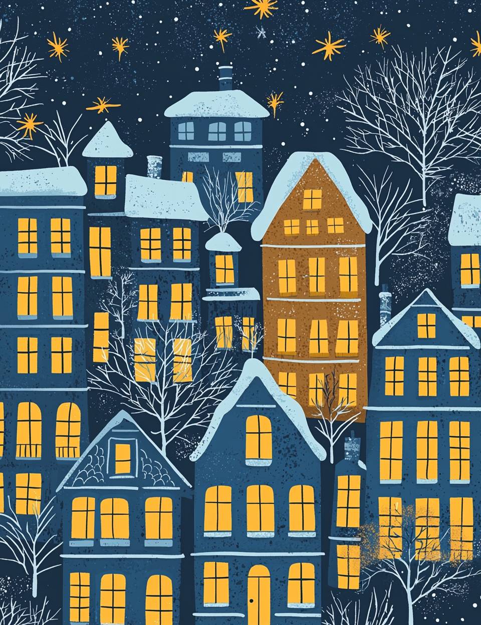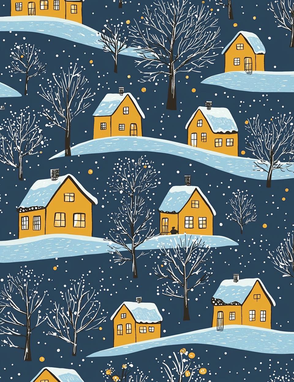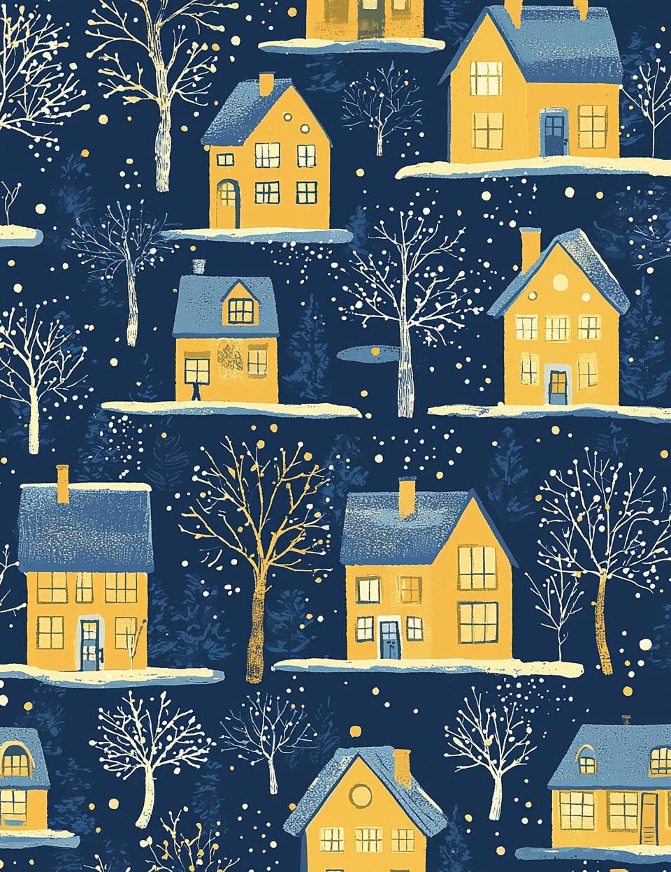 Yellow windows on a blue background, a Christmas night pattern in the style of Tove Jansson and Harriet Lee-Merrion. --ar 10:13 --quality 2 --v 6.1