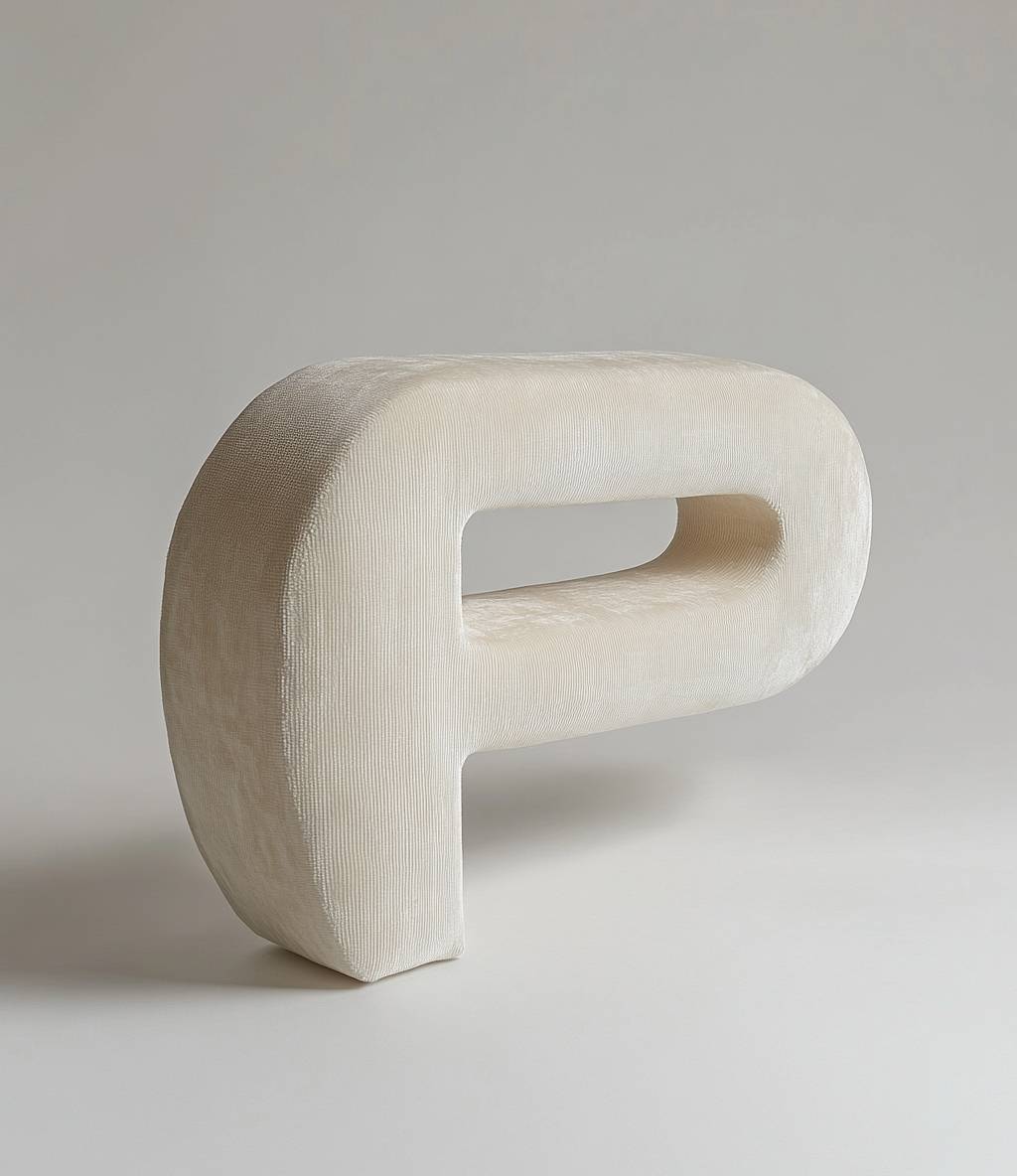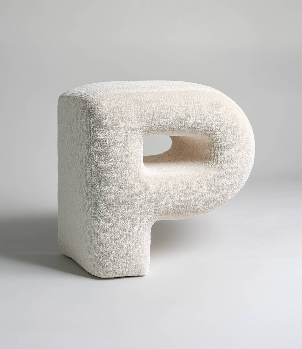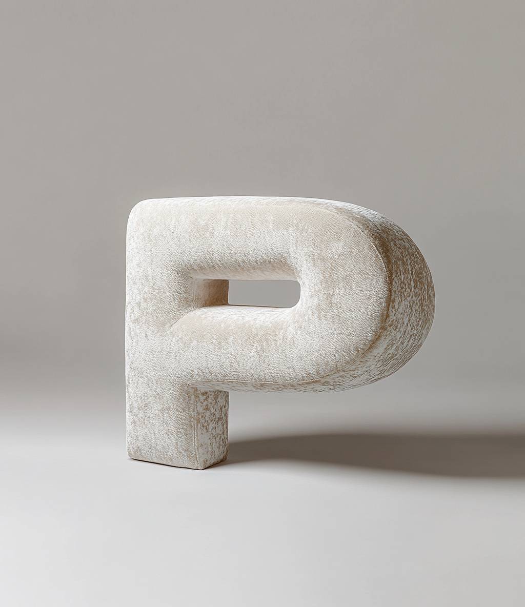 The letter "P" is made of white velvet fabric, upholstery. In shape, it resembles an elongated oval with rounded edges at both ends. The interior design concept uses warm tones --ar 79:91 --v 6.1