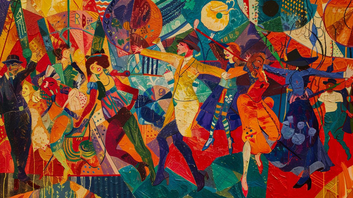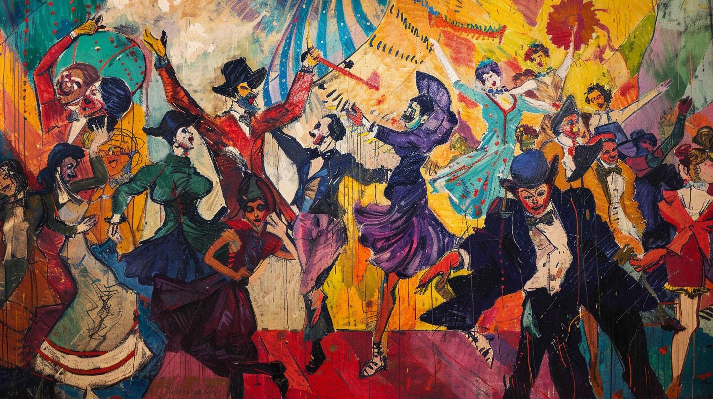 A lively and colorful scene of circus performers, featuring acrobats, clowns, and dancers, in the style of Henri de Toulouse-Lautrec, with bold lines and dynamic compositions --v 6.0 --ar 16:9