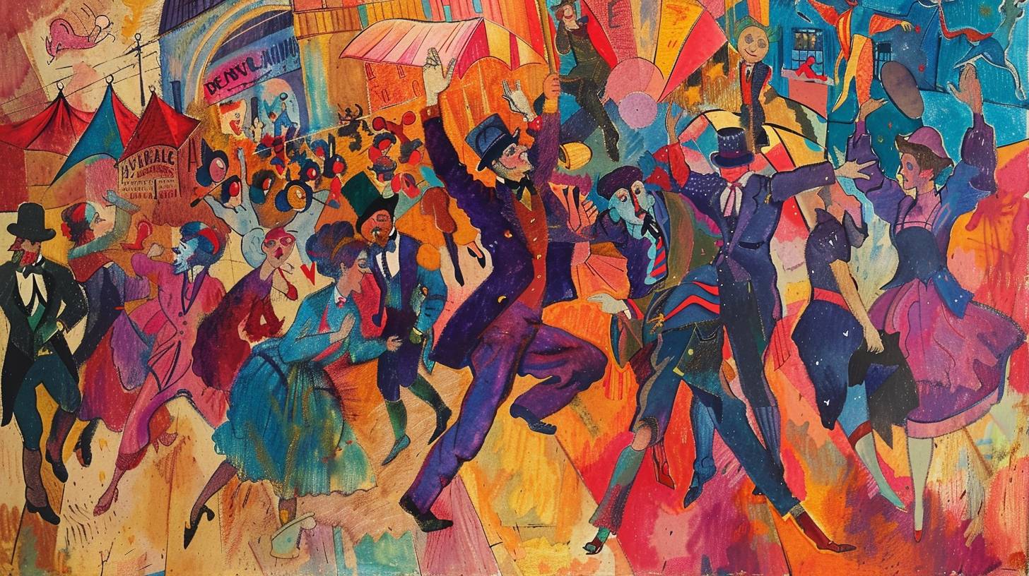 一幅生动多彩的马戏团表演者场景,包含杂技演员、小丑和舞者,风格类似于亨利·德·图卢兹-罗特雷克,具有大胆的线条和动态的构图。