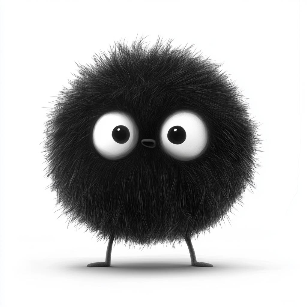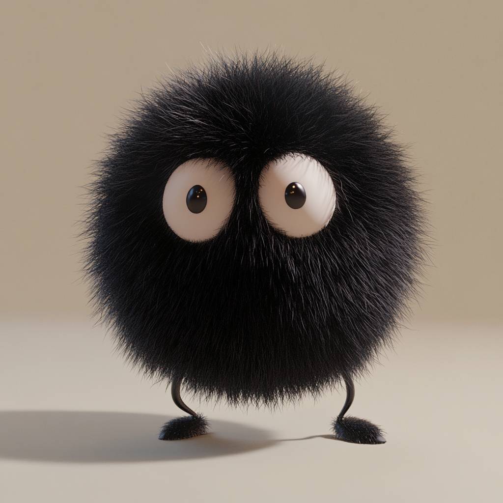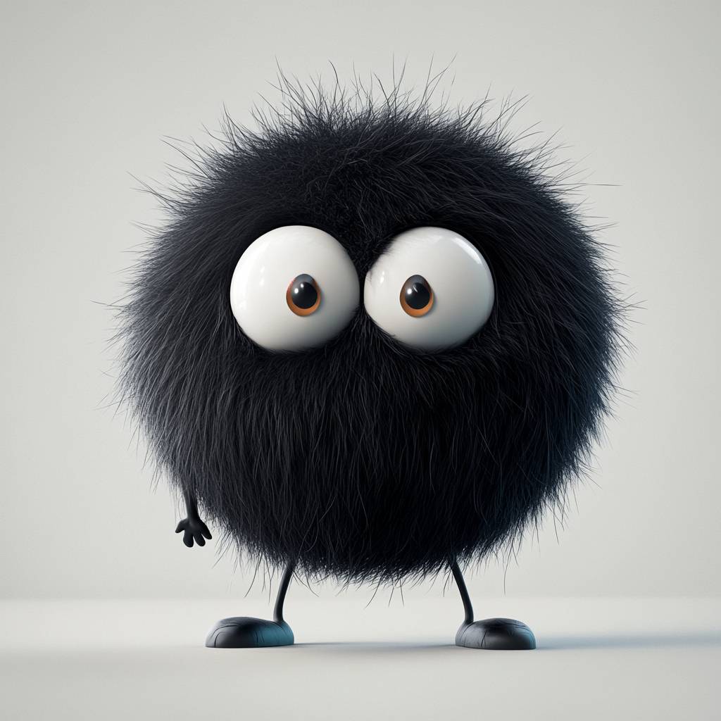 一个毛茸茸的小黑球角色,拥有很小的眼睛和小嘴巴,细腿和细胳膊,面带可爱的表情。