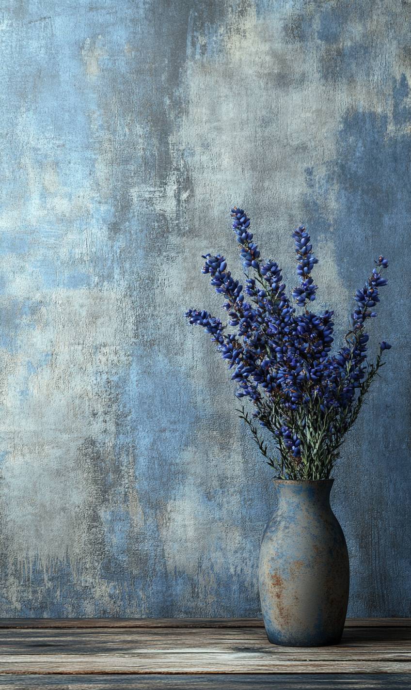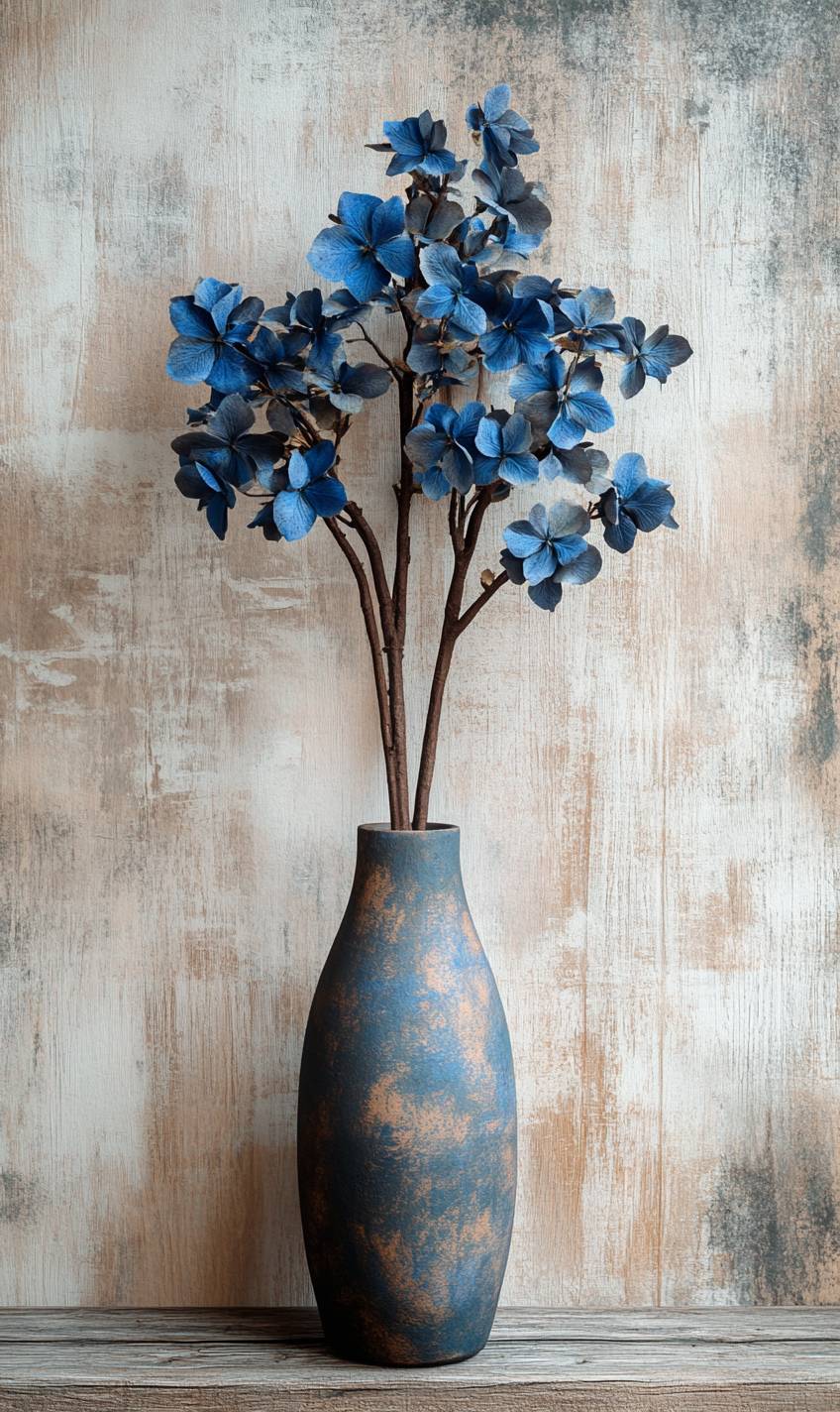 realistic flower blue dark on vase OLD wooden beige texturePatterns on an Old Grunge Wall , sharp focus, ultra realistic, highly detailed, render, 8k --ar 3:5 --v 6.1