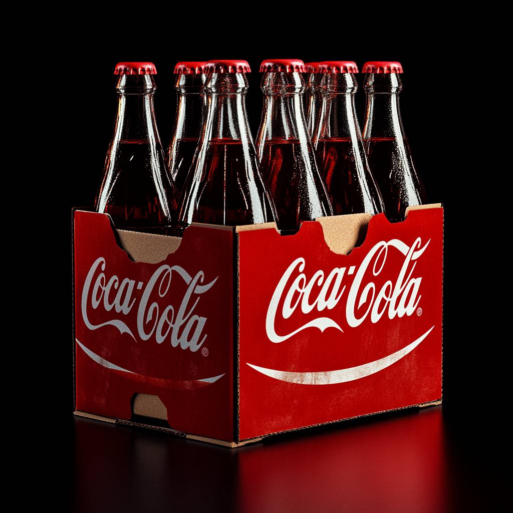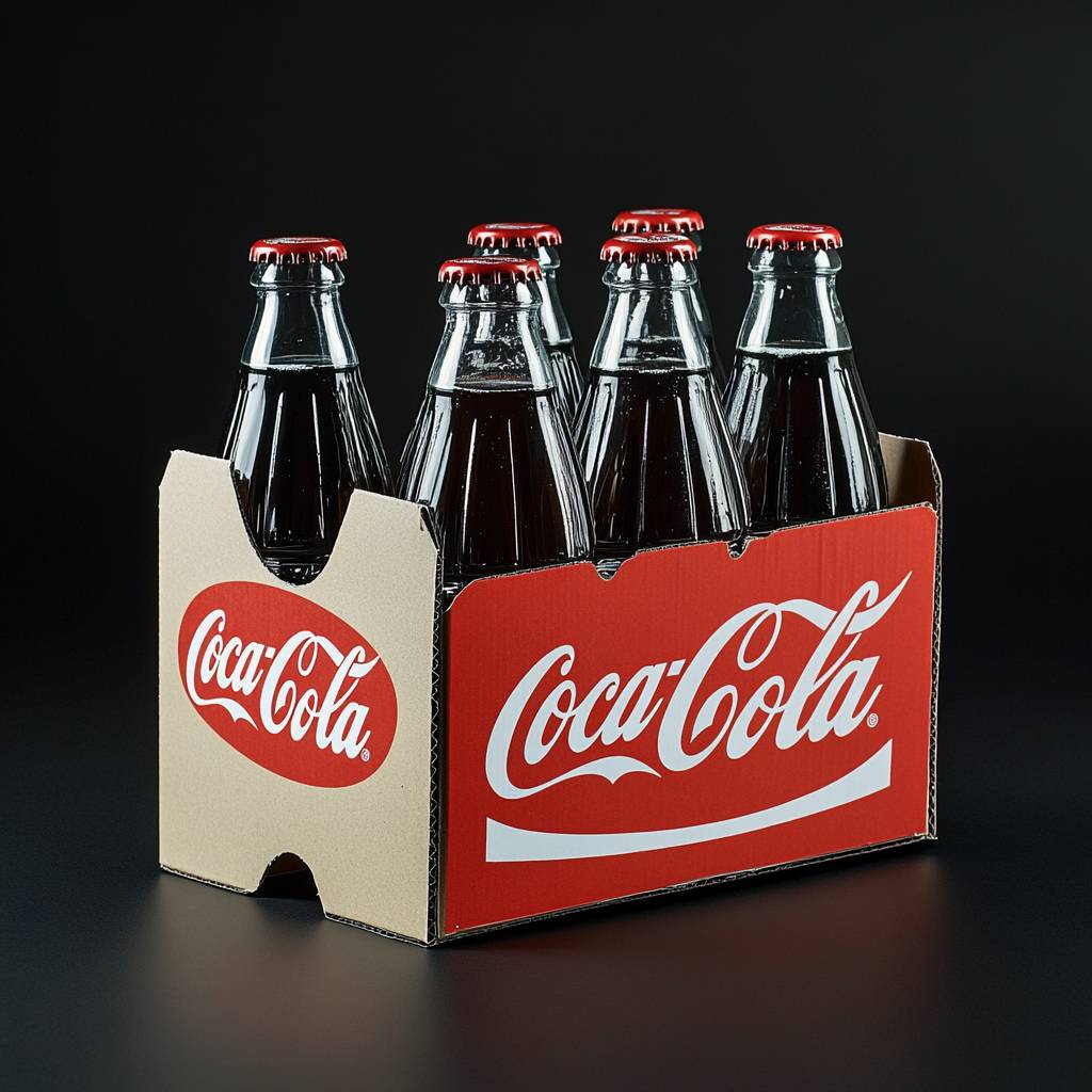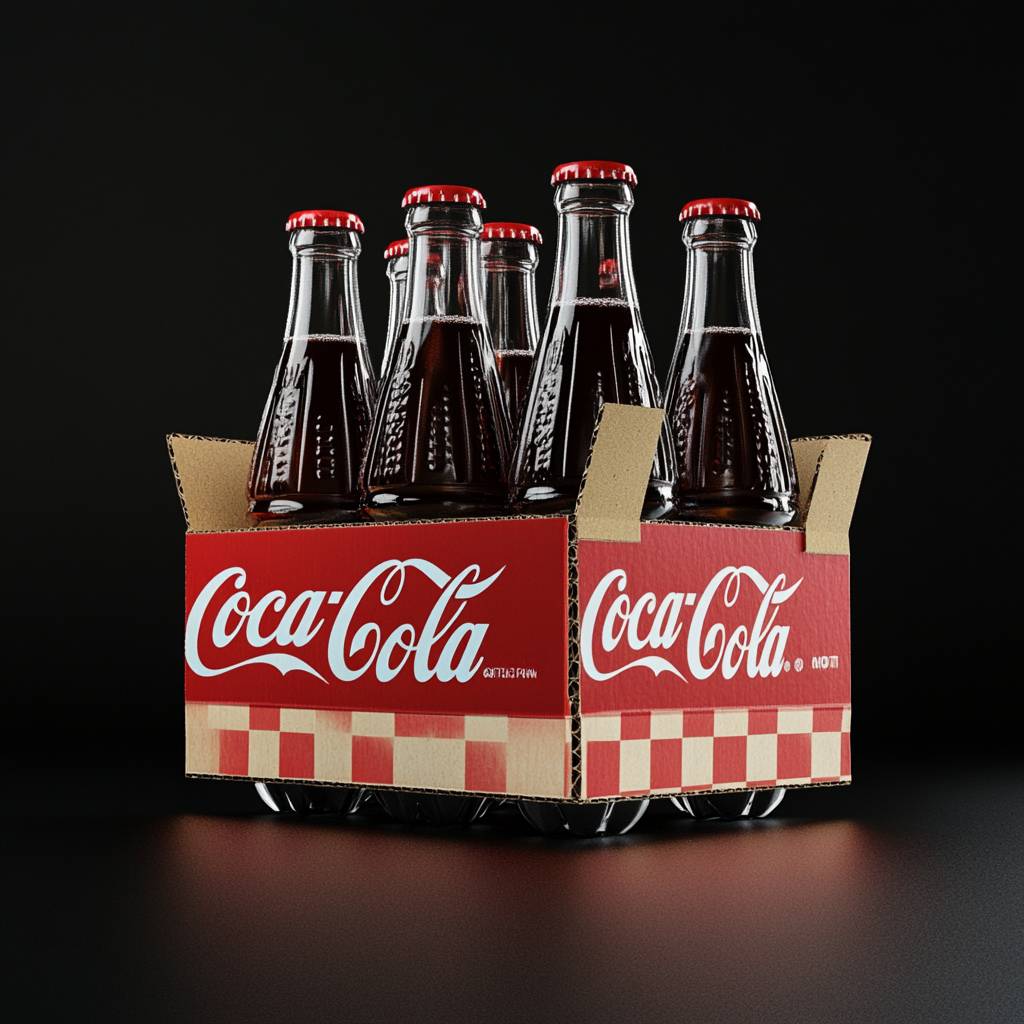 realistic image of a six-pack of Coca-Cola returnable glass bottles. The pack is a cardboard shoe box imitating a Vans shoebox. on a solid black background --v 6.1