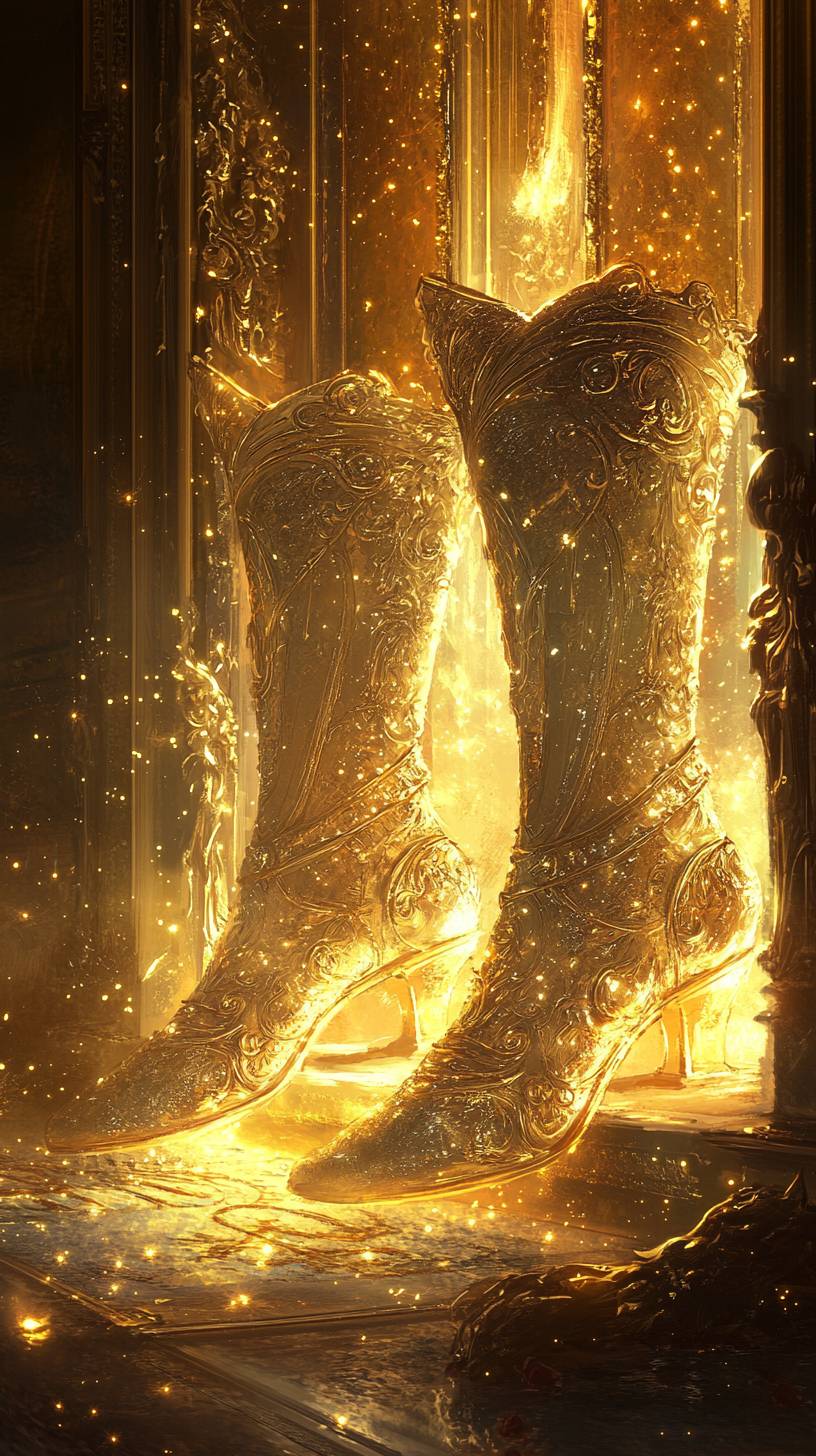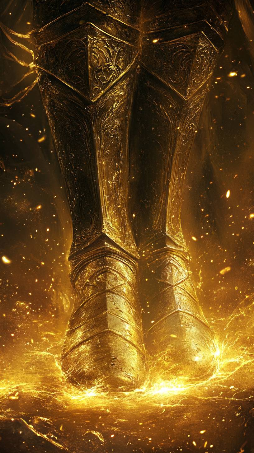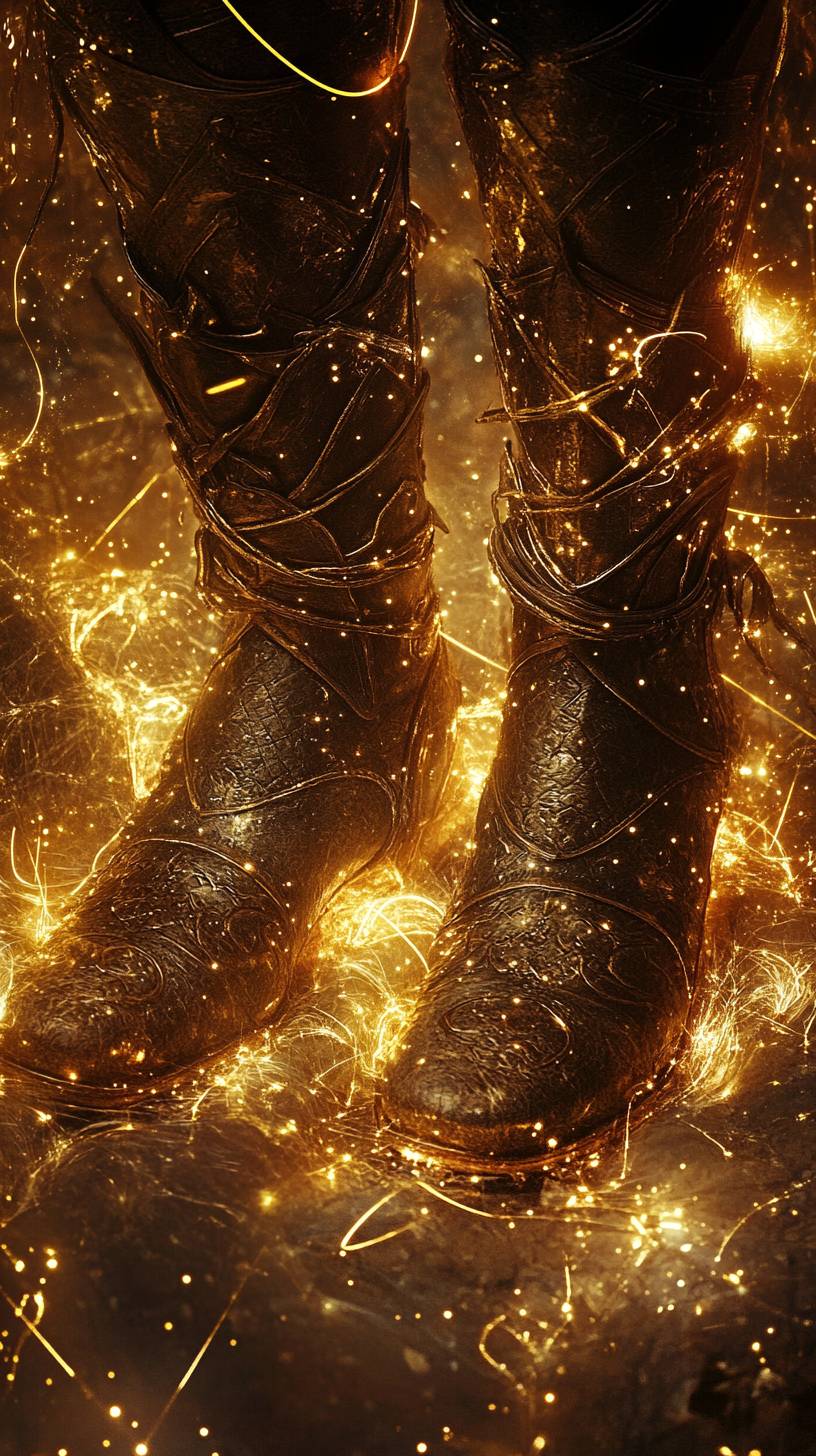 sabots armor shoes, surrounded by golden lighting, creating an atmosphere of mystery --ar 9:16 --v 6.1