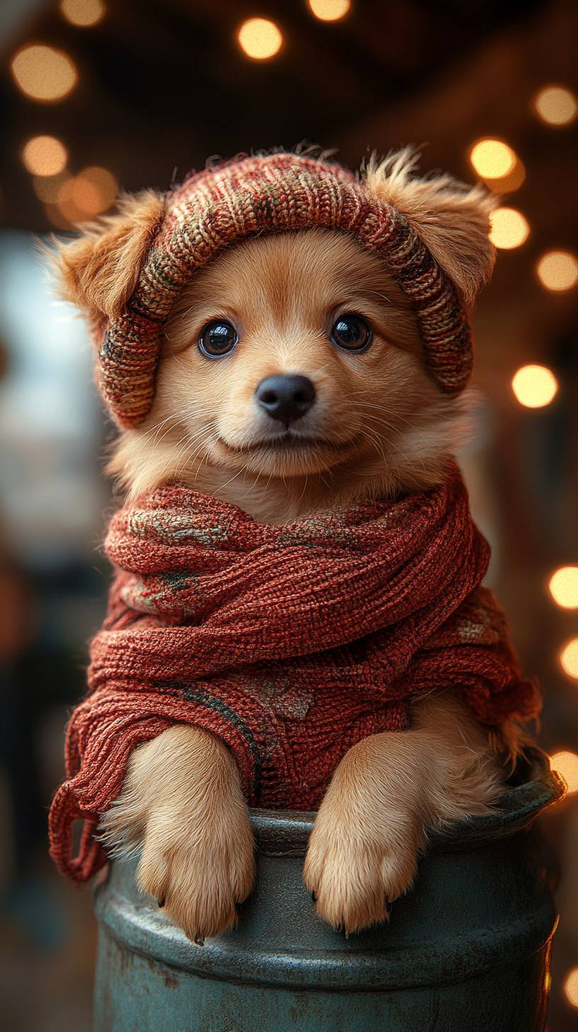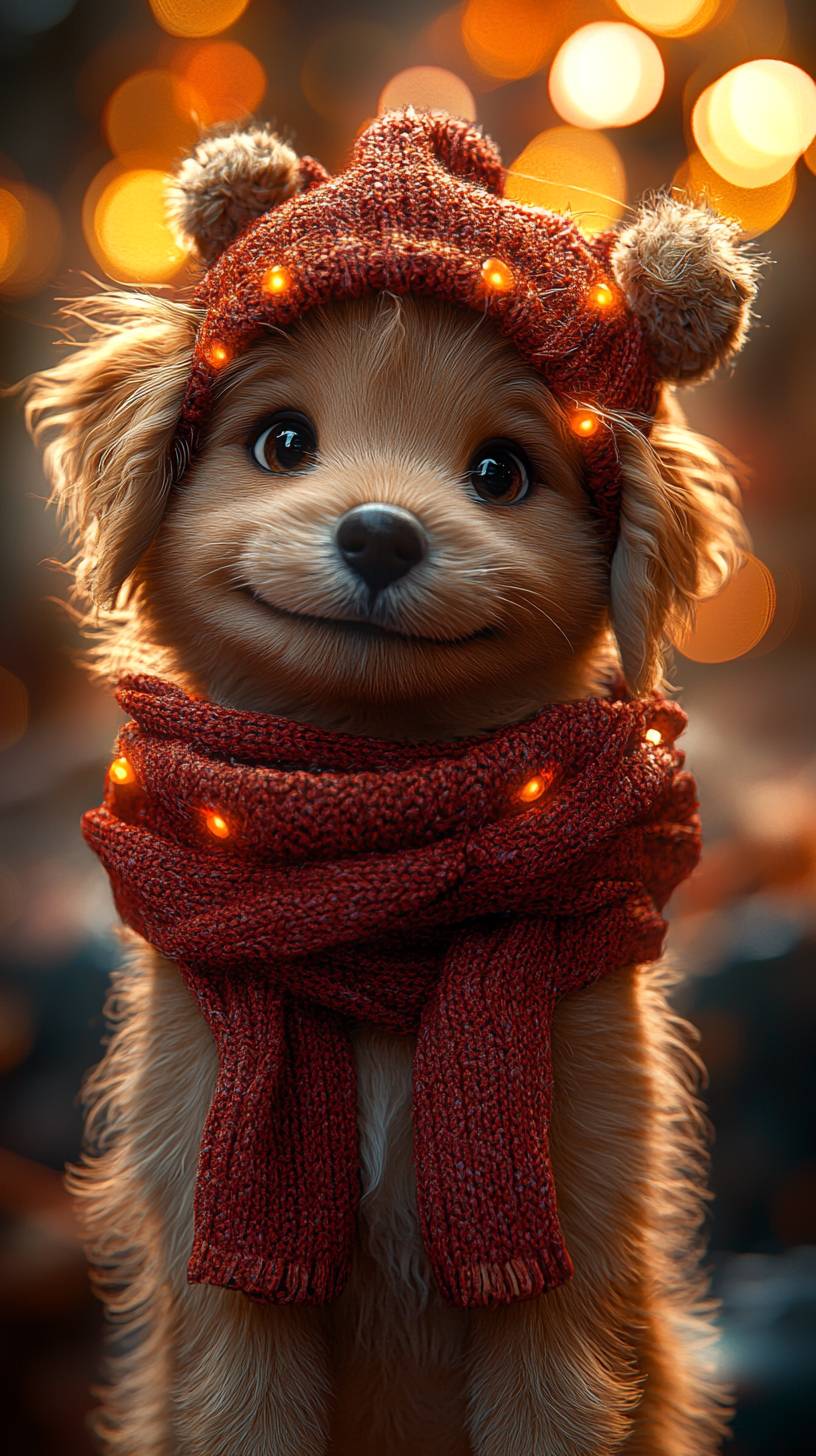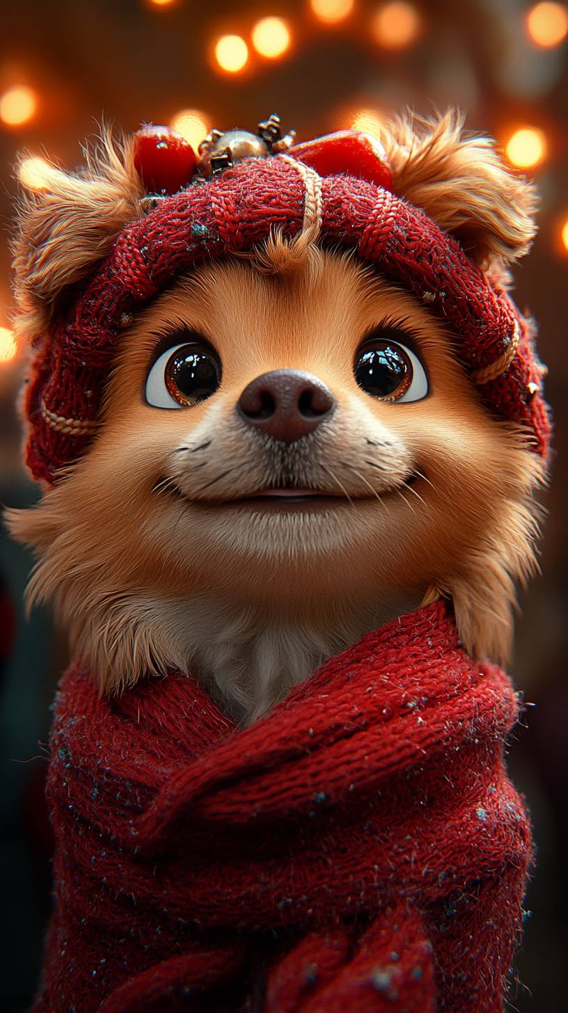 A sweet, adorable puppy wrapped in soft, glowing Christmas lights. The puppy looks cozy and content, surrounded by the warm glow of holiday lights with a festive, joyful atmosphere. The background is softly blurred with hints of holiday decorations, adding a magical, heartwarming feel to the scene. Hight definizione. Cartoon style. Disney theme. 500mm. Children book style. In stile ad alta gamma dinamica, illustrazioni animate, daz3d, realismo esotico, scolpito, intensità da primo piano, caos intensità da primo piano 20 --ar 9:16 --style raw --stylize 1000 --v 6.1
