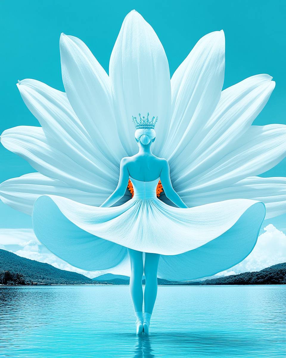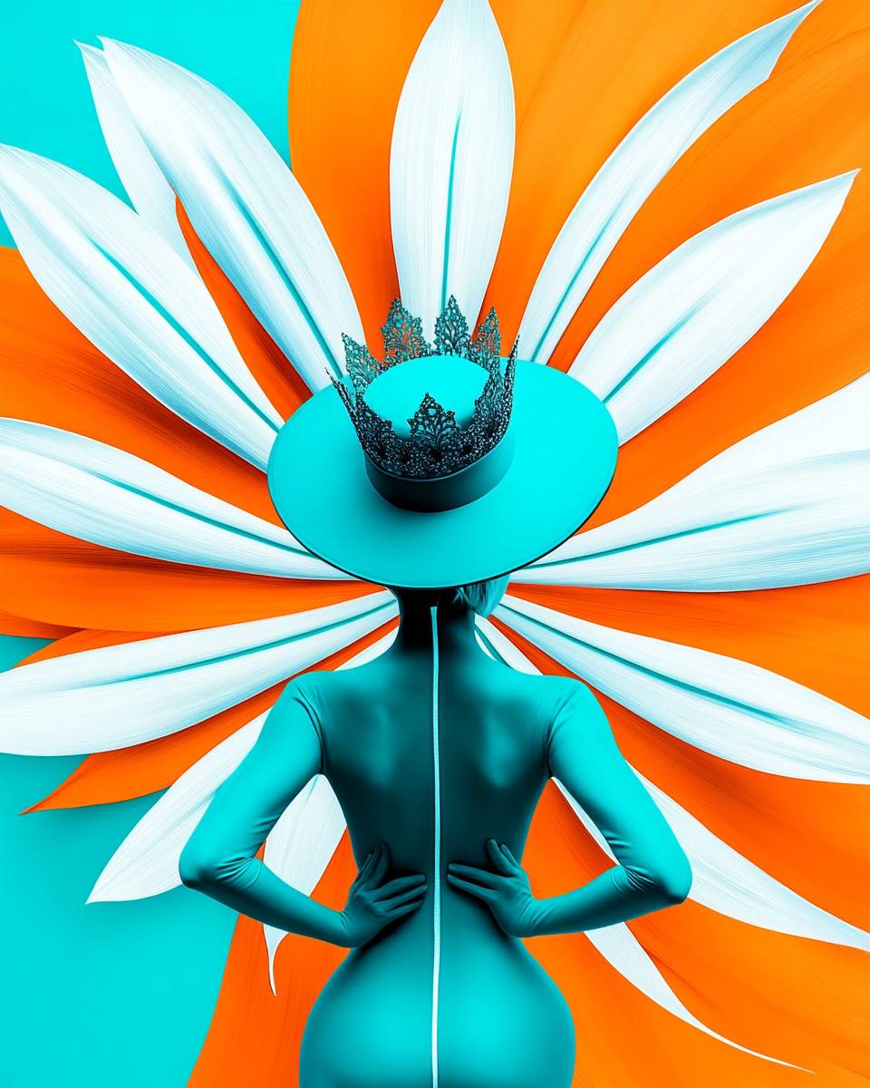 teal and orange photograph of the back view of an elegant dancer wearing a crown. Behind her is a giant daisy flower with petals that resemble dancing legs. The composition is symmetrical, with high contrast, resulting in a hyper-realistic photographic effect. --ar 103:128 --personalize czupcdd --stylize 750 --v 6.1