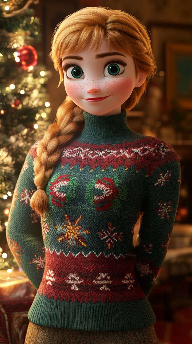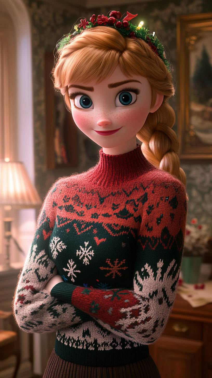 Anna from Frozen, wearing an ugly Christmas sweater, at home, full body portrait, 4K --ar 9:16 --v 6.1