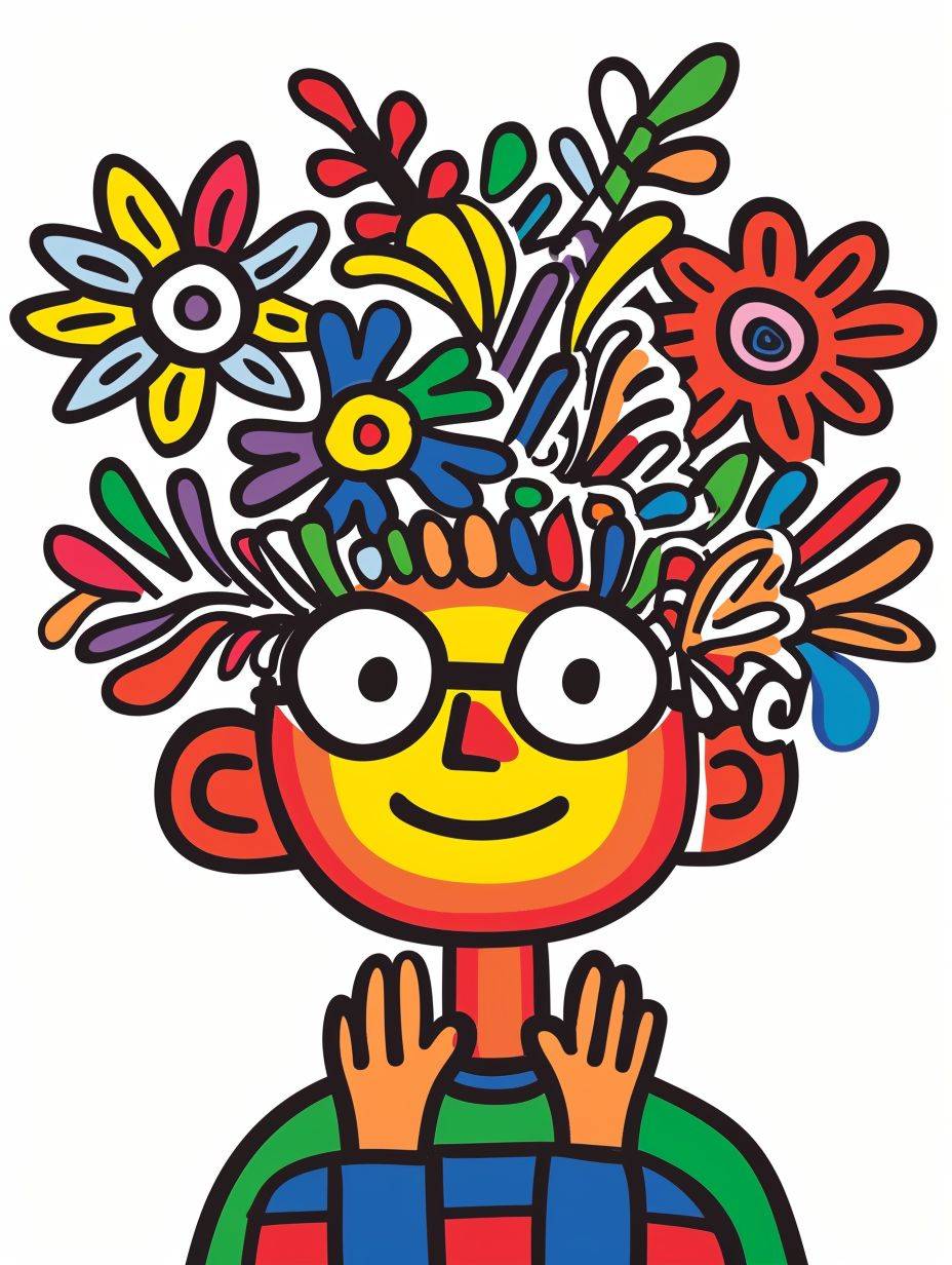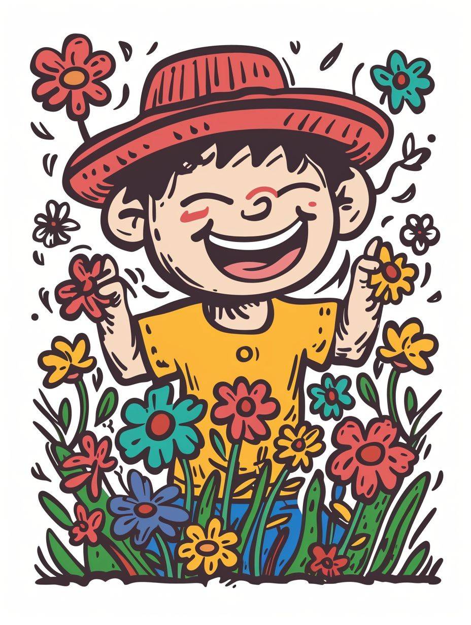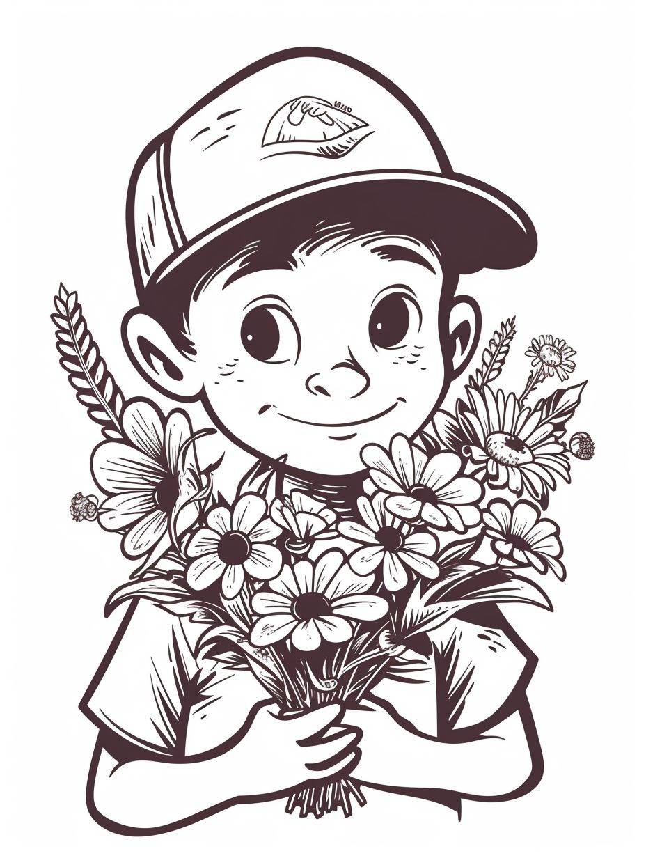 for t-shirts printing, outline, contour style,2d, flat design, white space to fill, no spirals, no shadow, 8k resolution similiar,keith haring style, fun, happy, boy with flowers --ar 3:4 --v 6