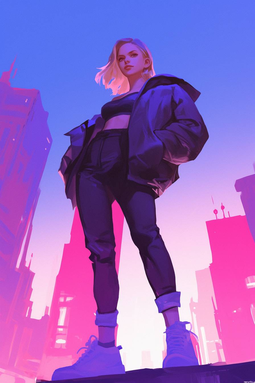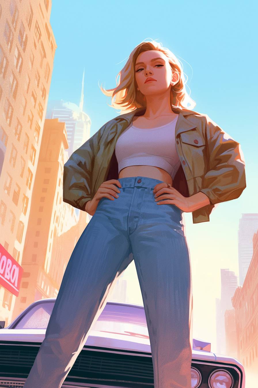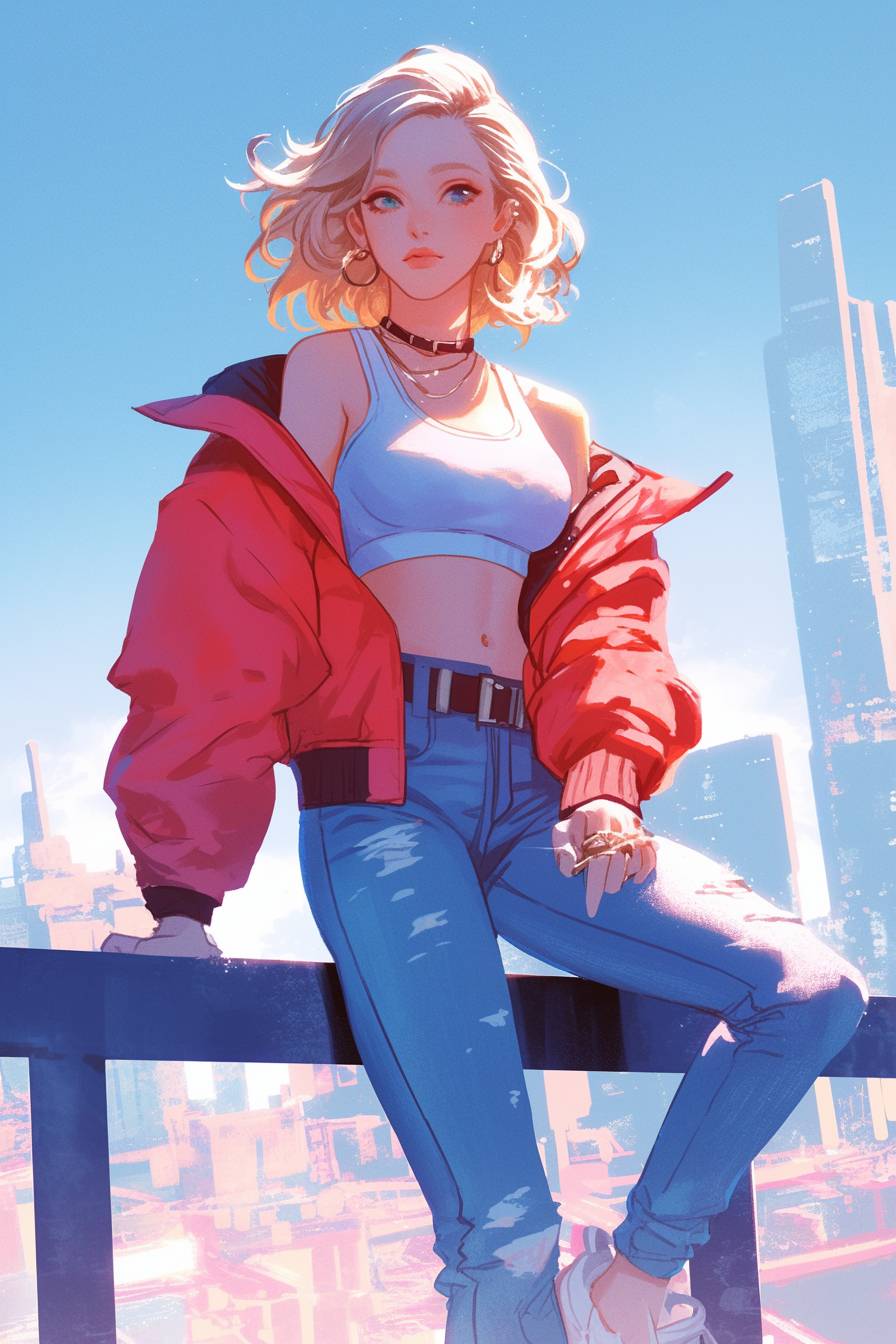 Scarlett Johansson, modern streetwear, cropped jacket, slim-fit jeans, sneakers, vibrant city backdrop --niji 6 --ar 2:3