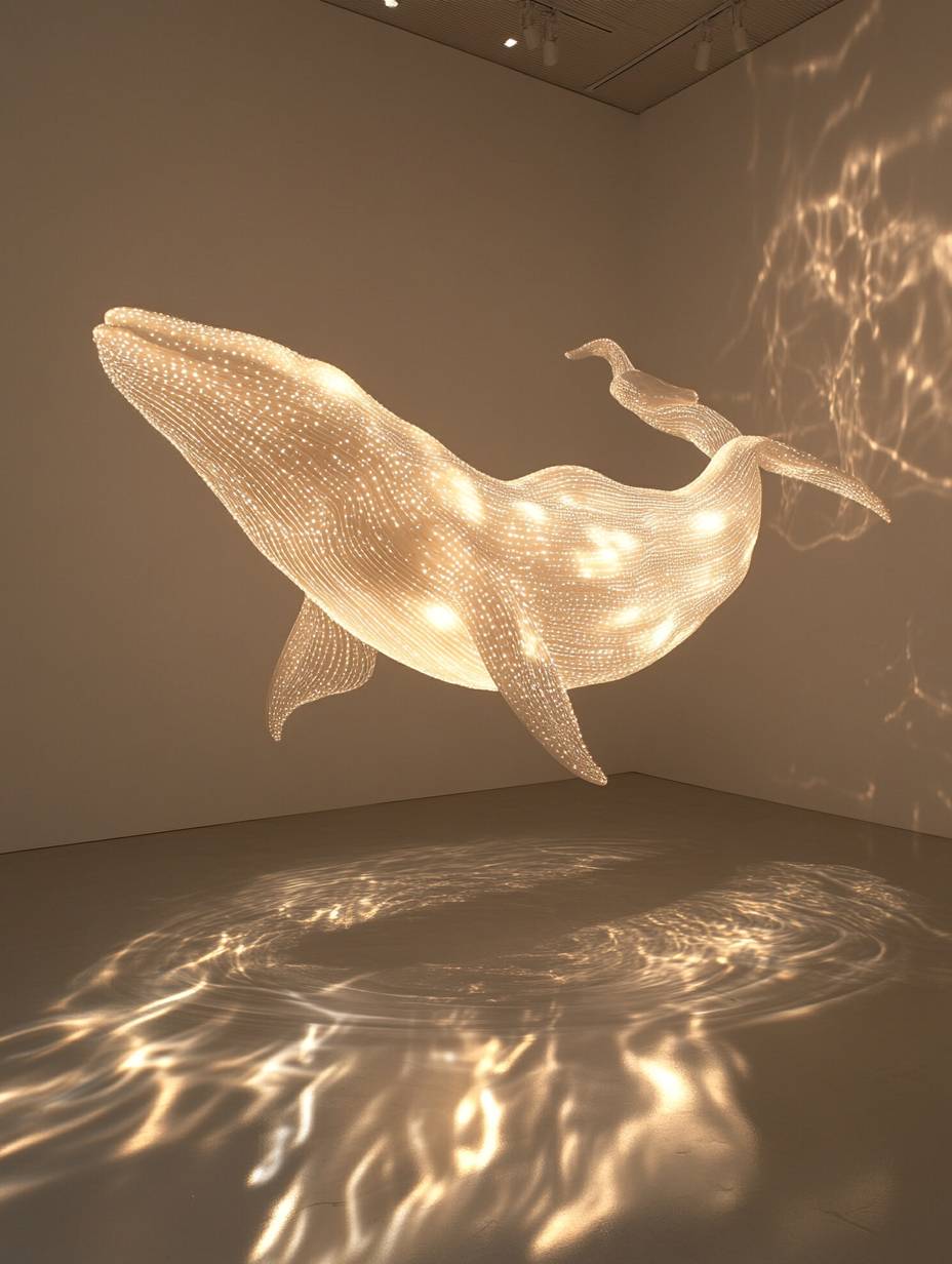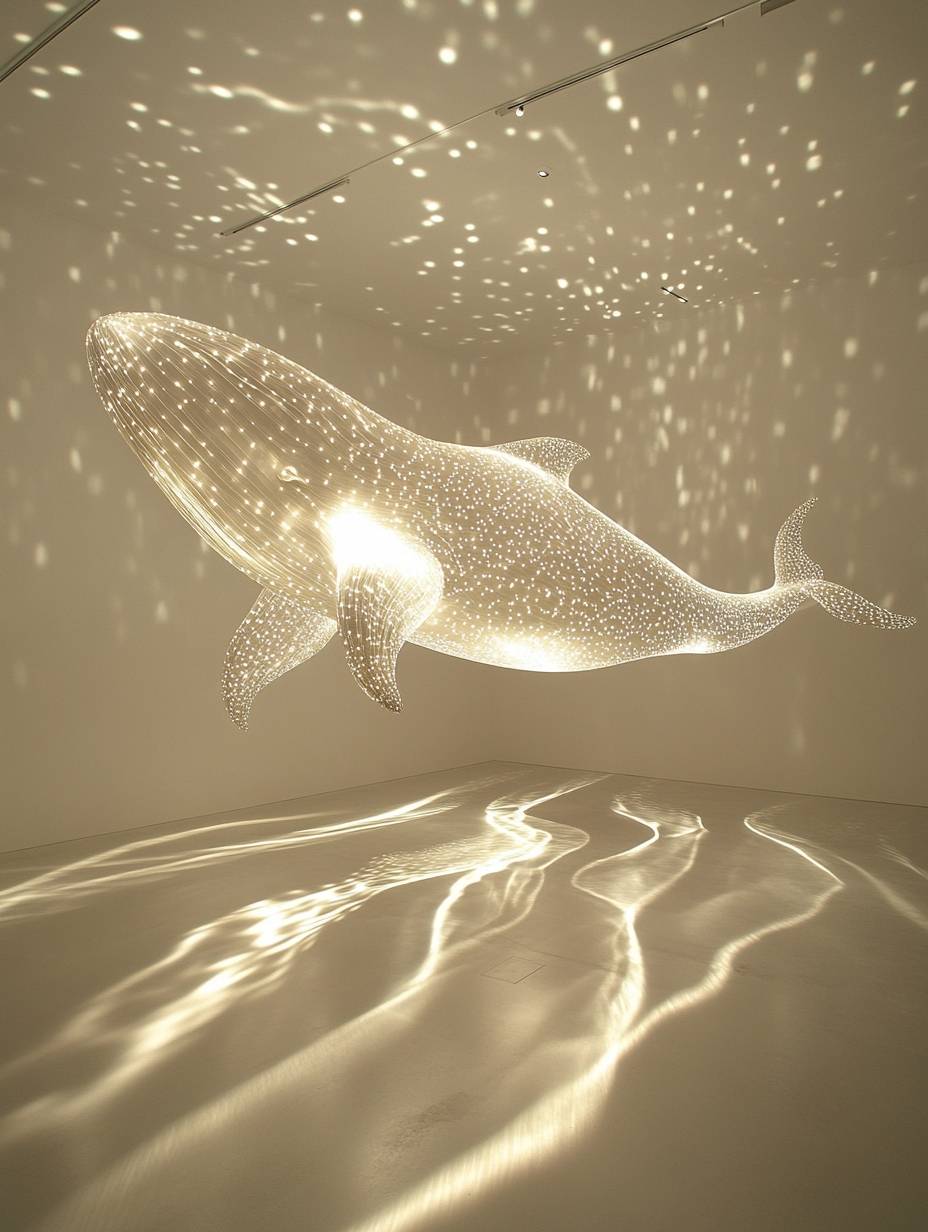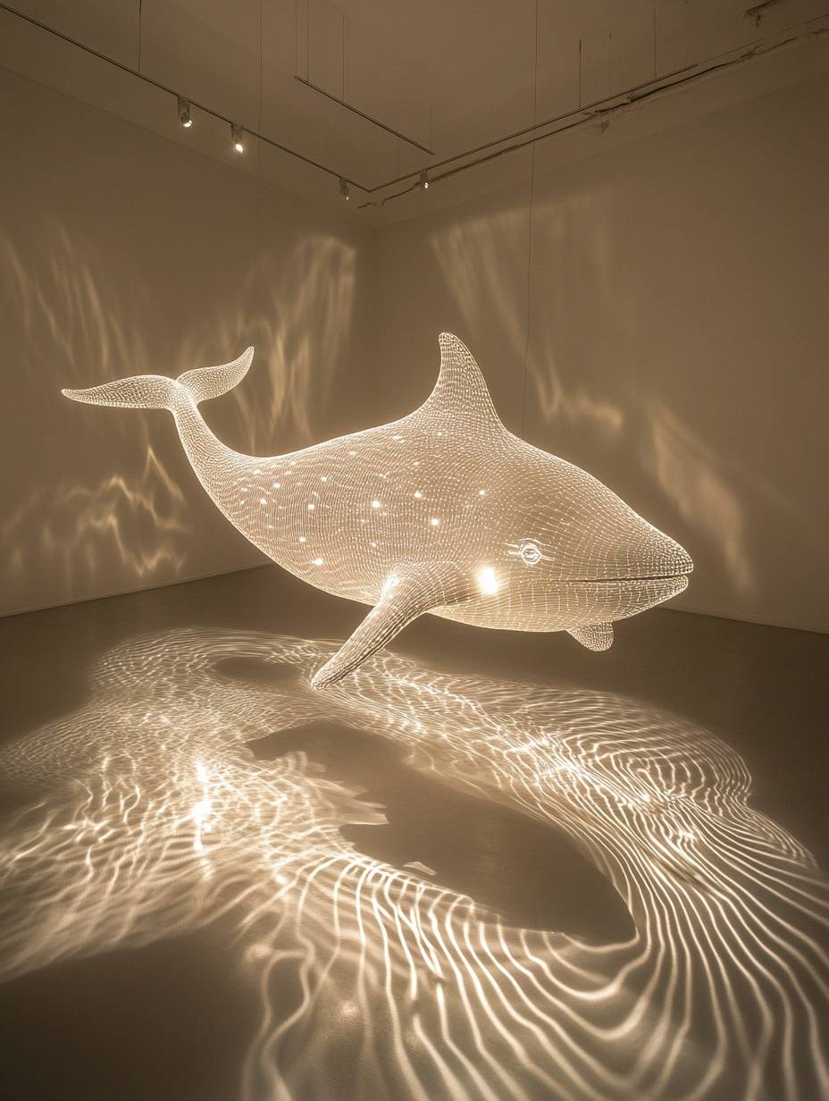 一只由灯光组成的白色鲸鱼,漂浮在空中,投射出复杂的阴影在全白的画廊地板和墙壁上。光绘艺术,发光装置,采用深米色和银色的风格。概念性装置艺术,带有波浪状的树脂片、发光颗粒和动态照明。超现实的水面带有涟漪和溅起的水花,细节丰富且极简。