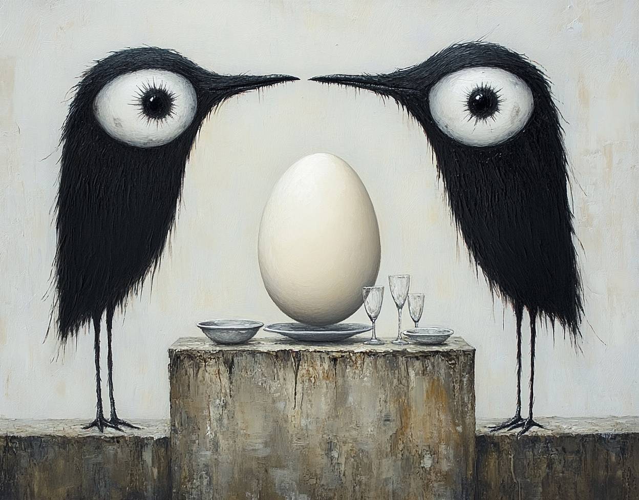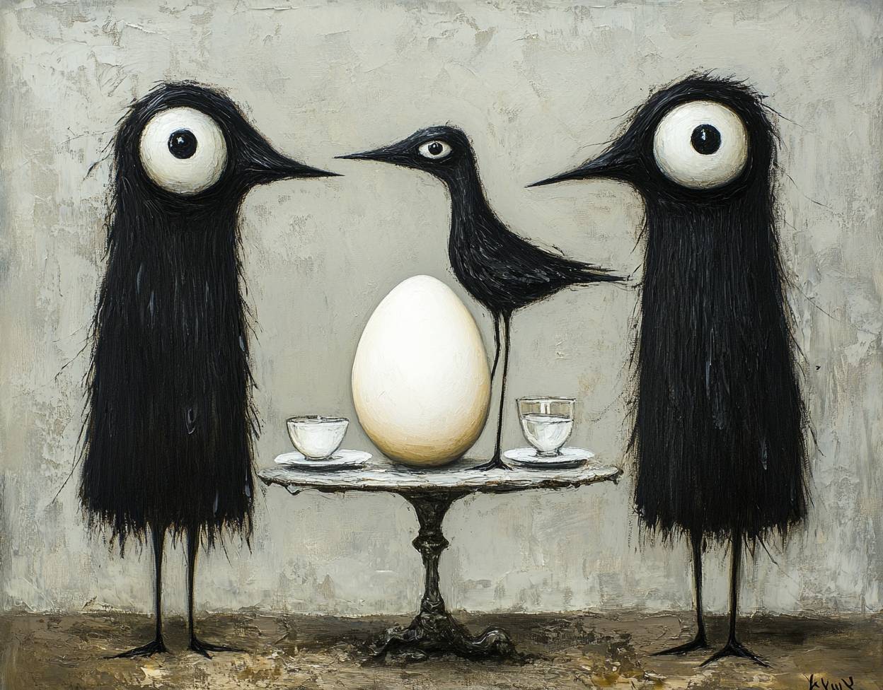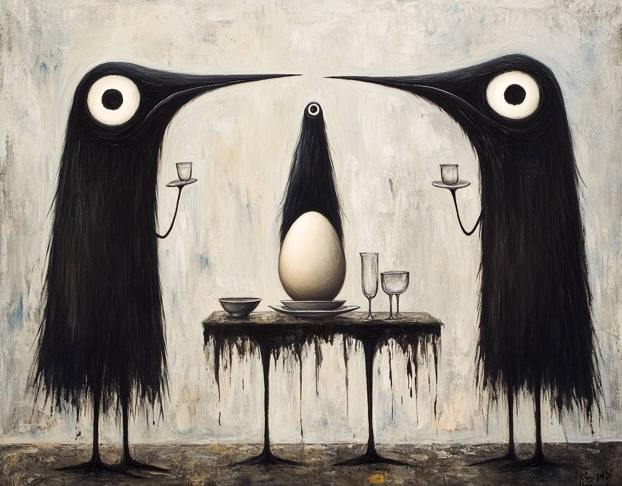 一幅超现实主义油画,背景灰色,描绘一个鸡蛋、两只黑色的大眼睛和短腿,持有眼镜和盘子,另有类似鸟嘴的生物坐在桌子上,上面放着碟子和碗。