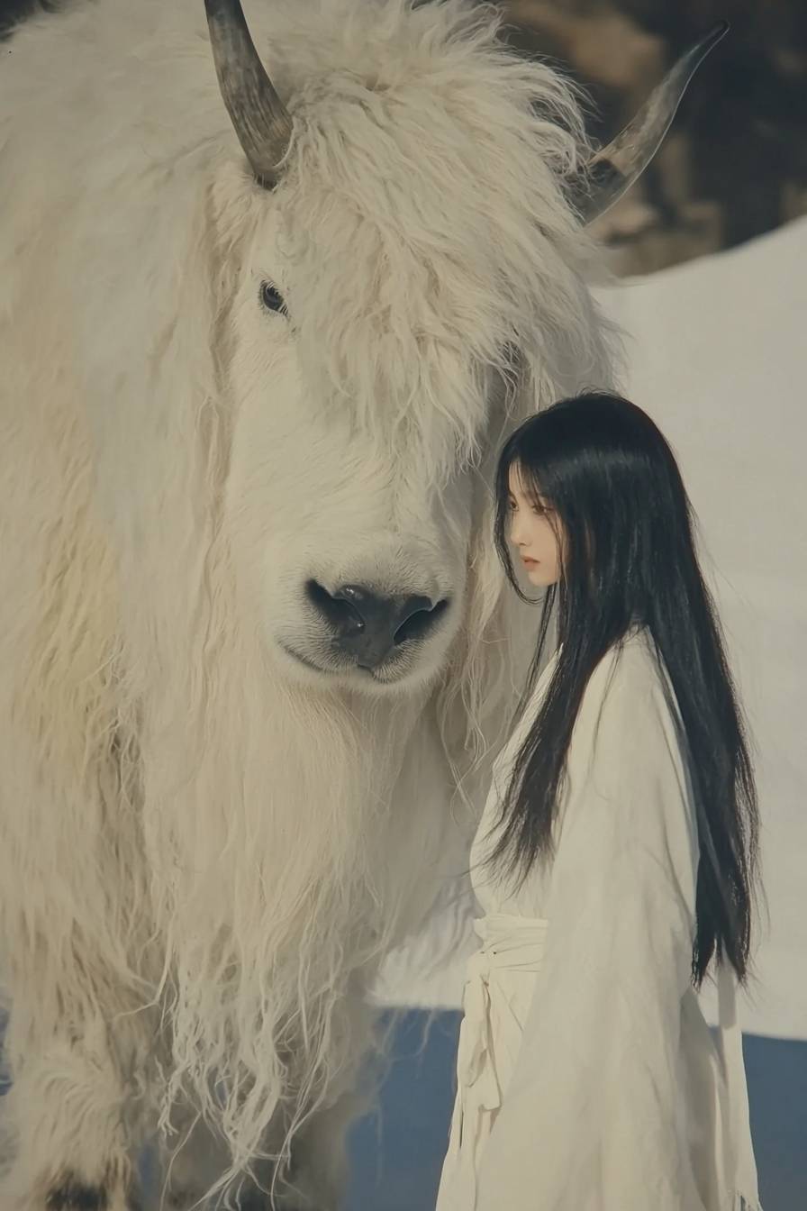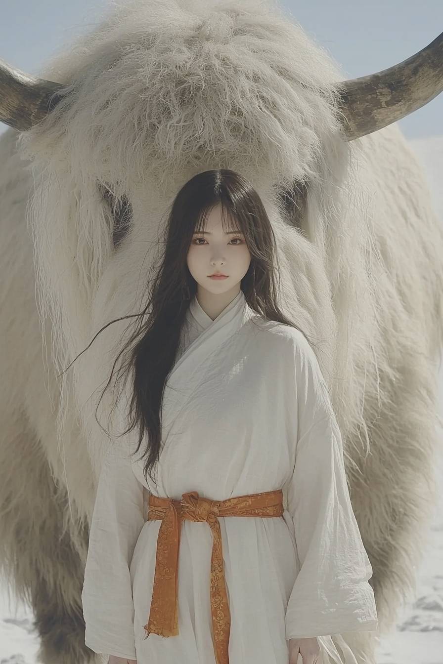 美丽的中国模特穿着白色汉服,站在巨大的白色牦牛旁,展现出极简高端的艺术场景。