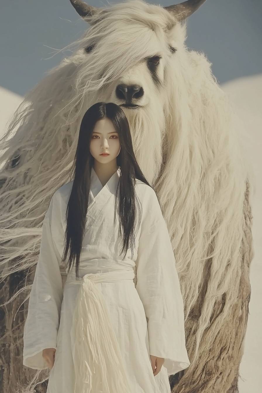 Beautiful Chinese model stands next to a huge white yak, wearing white Hanfu,white sand dunes, windy, Minimalist high-end scenes, artistic story scenes, film colors, film photography, full-body shooting --ar 2:3 --quality 2 --style raw --sref 4068928477 3628282212 3703005997 964693539 --personalize 4rphxok --stylize 1000 --v 6.1