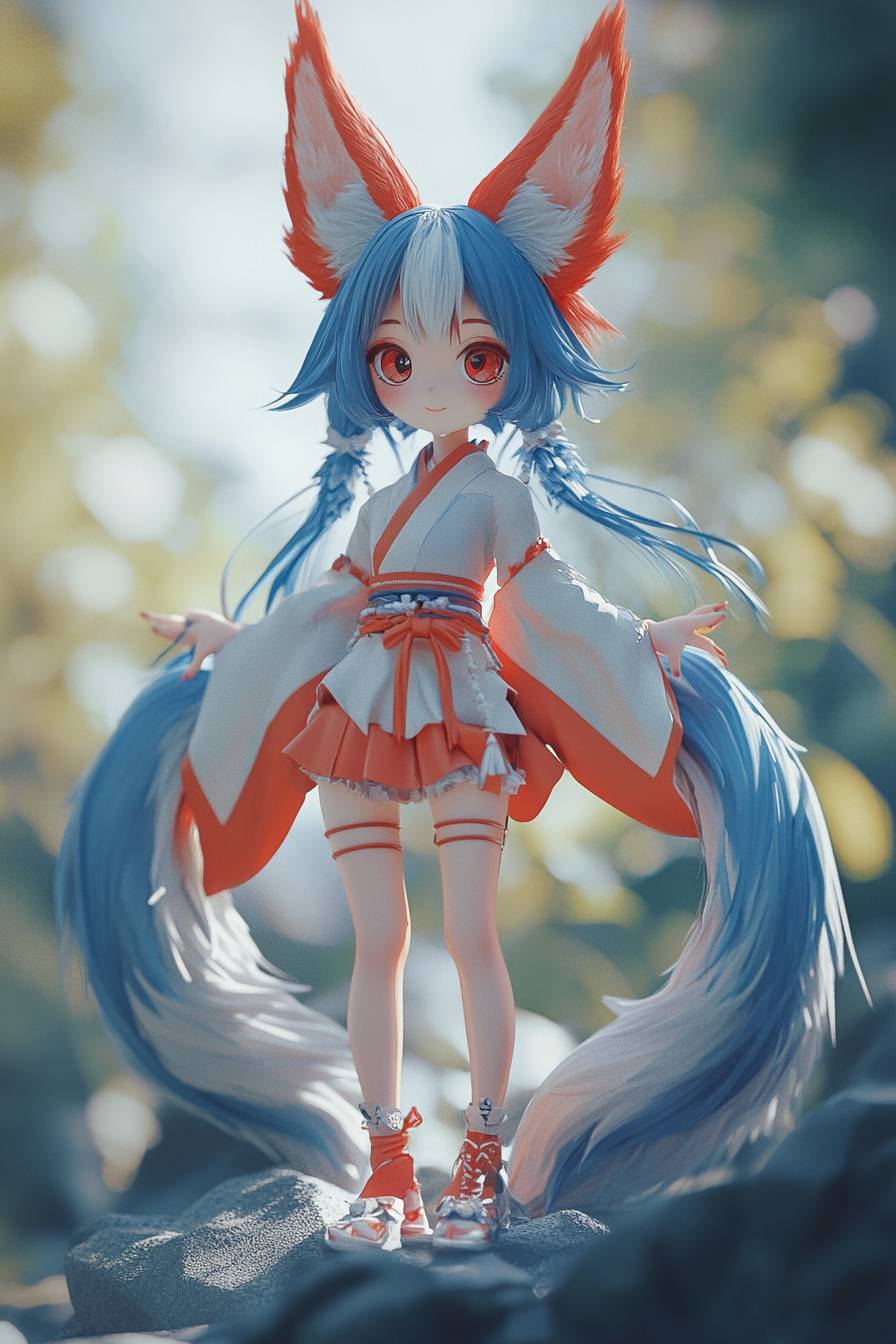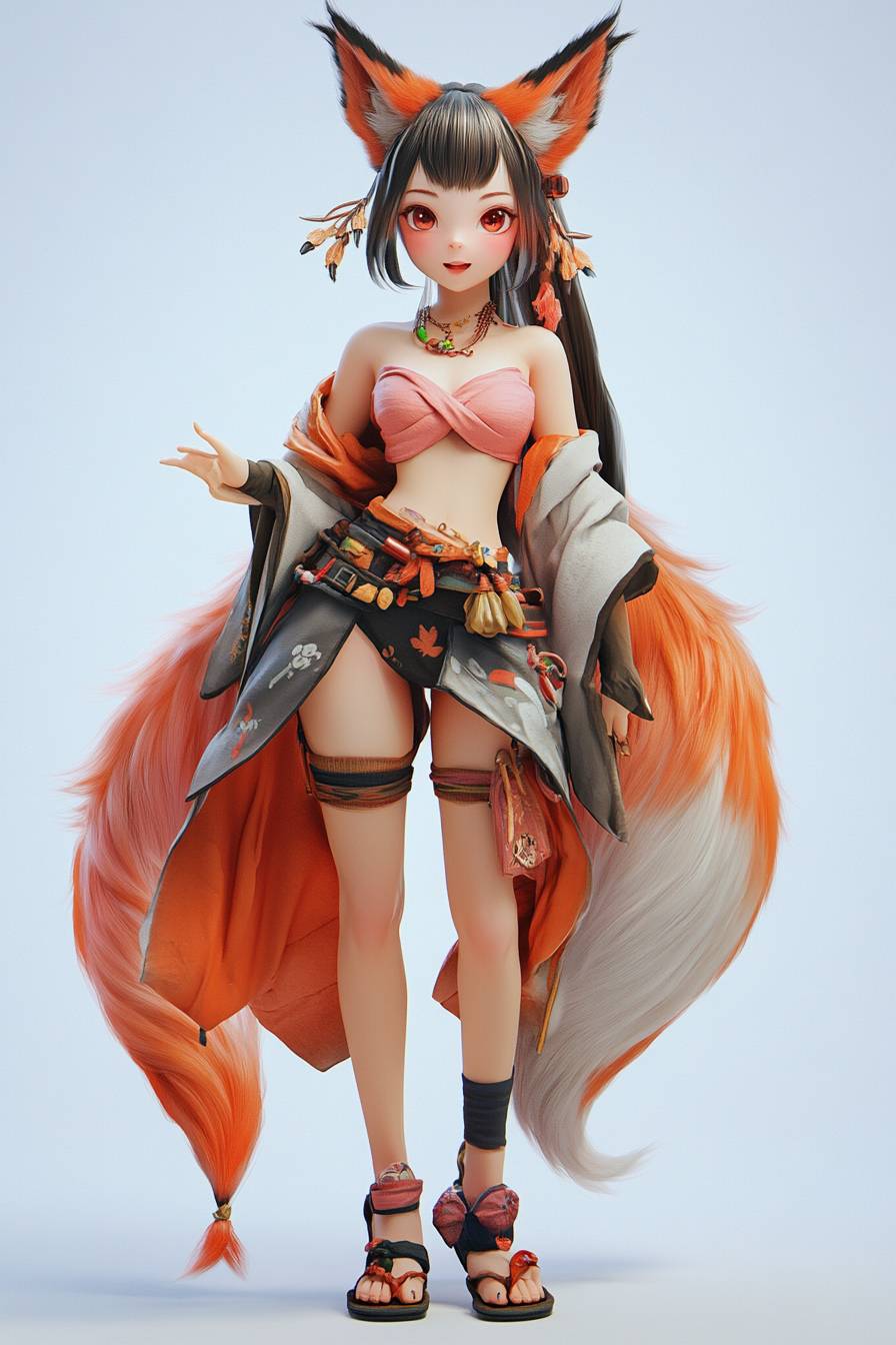 东方风格的九尾狐女孩,头占身体40%,九条尾巴颜色各异,皮克斯风格,超可爱,3D渲染。