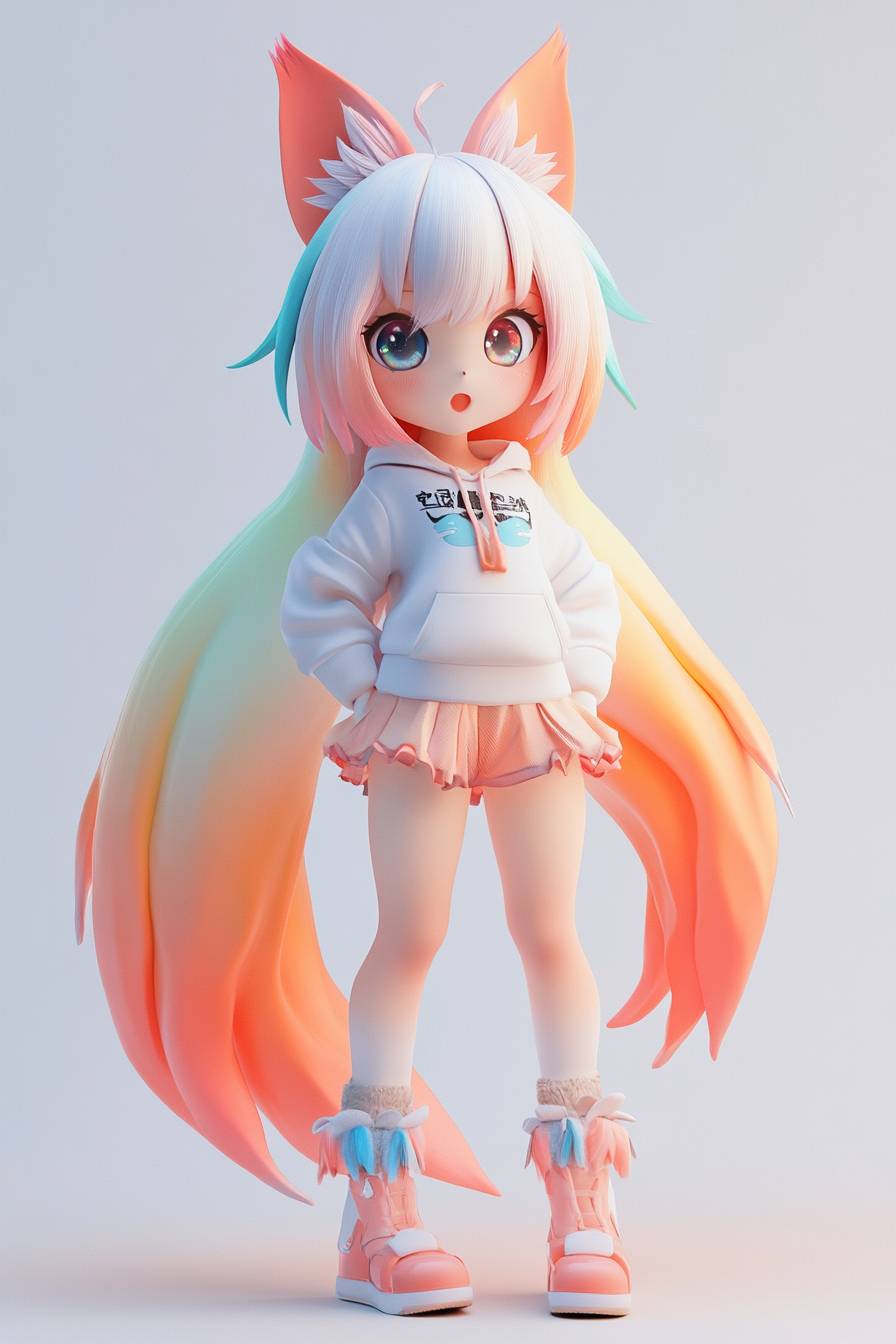 东方风格的IP图像,九尾狐女孩,九尾狐面孔,小身材大头,头占身体的40%,所有九条尾巴颜色不同,色彩鲜艳,穿着短裤和短袖,全身,皮克斯风格,超级可爱,可爱的卡通,柔和的颜色,灰色墙壁,角色设计,八级高清渲染,3D,C4D,3D渲染