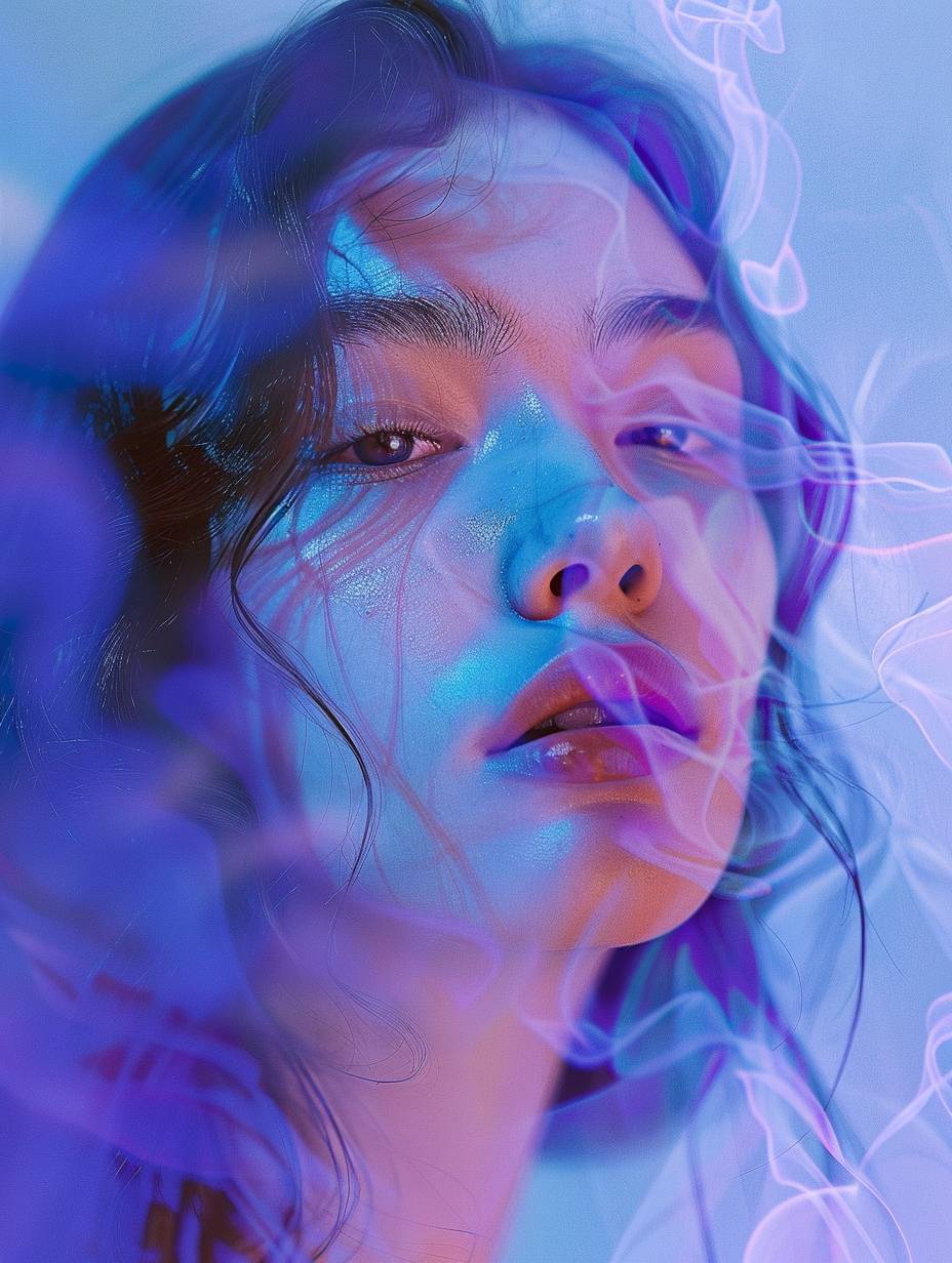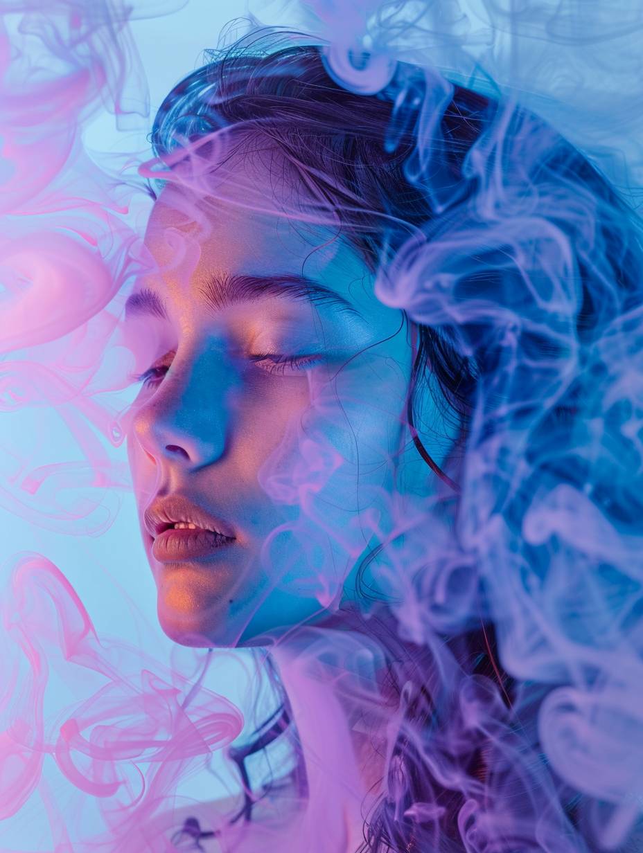 一幅年轻女子的肖像,周围环绕着流动和有机形状,营造出梦幻的氛围,背景是从淡蓝到紫色的柔和渐变。