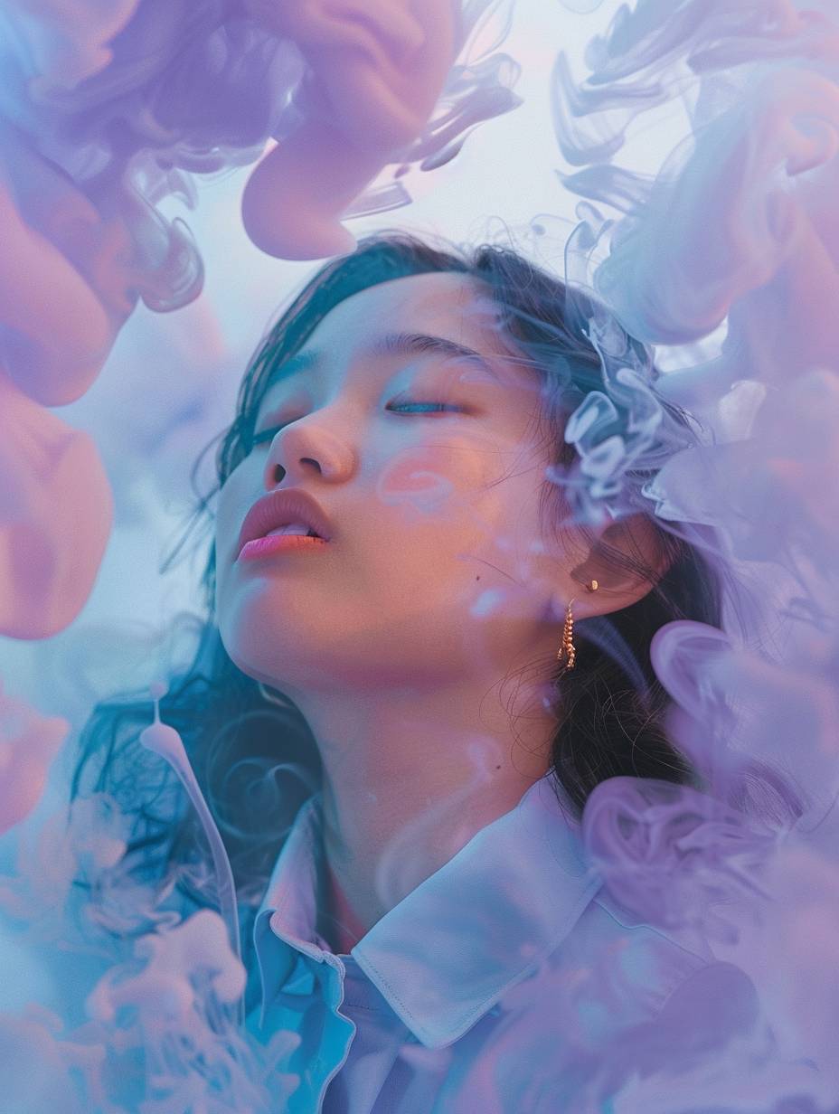 Portrait of a young woman surrounded by fluid and organic shapes, creating a dreamy atmosphere. The background features a soft gradient transition from light blue to purple, emphasizing the focus on the vibrant and intricate artwork --ar 3:4 --v 6.0 --style raw