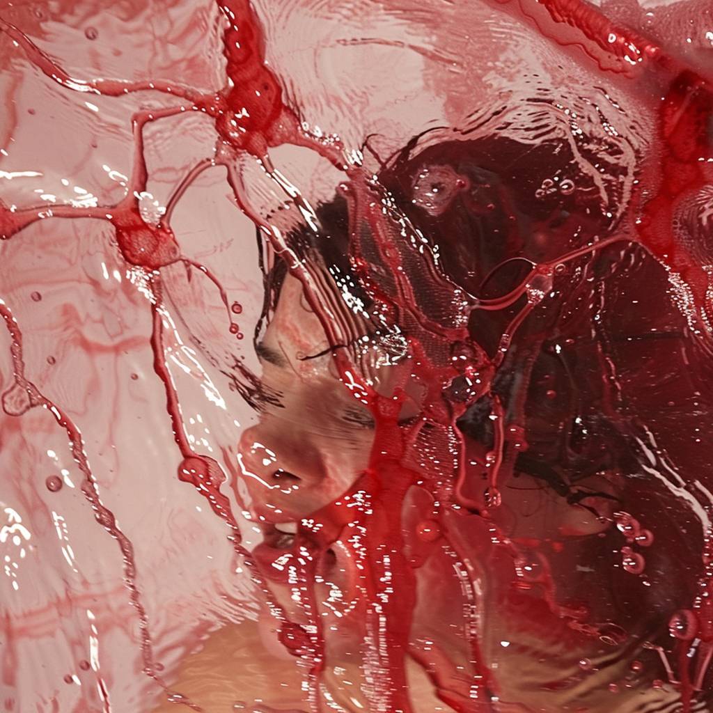 从上方拍摄,一位穿着派对服装的女性在水中,她的脸被融化的红色冰块覆盖,风格受到詹妮弗·鲁贝尔、实验电影、路易丝·布尔乔亚、航拍抽象、杜桑·杜卡里奇的影响,细节一闪而过,现实主义。